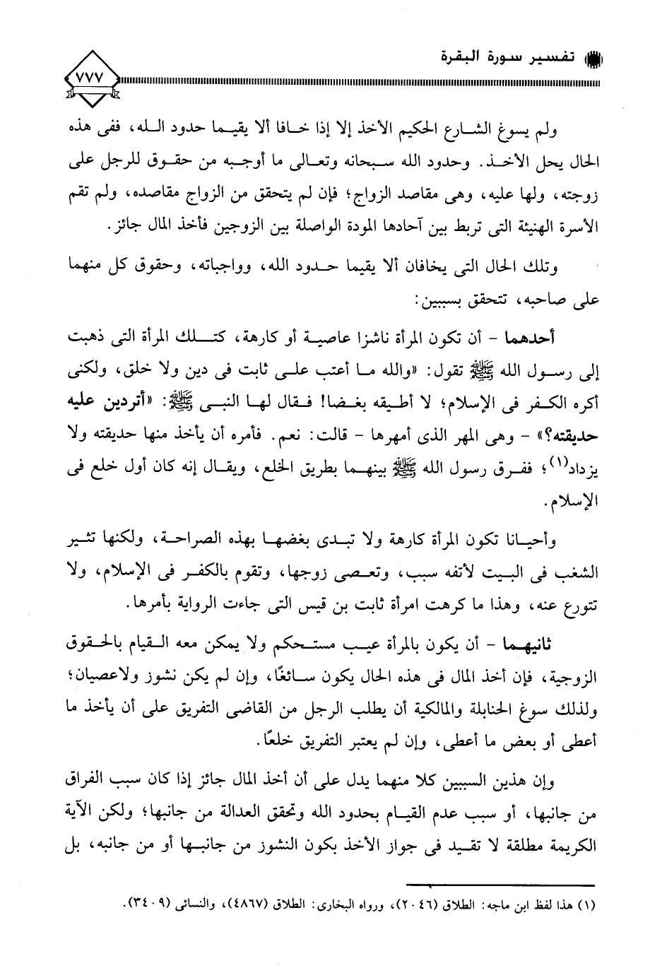 وإن هذين السببين كلا منهما يدل على أن أخذ المال جائز إذا كان سبب الفراق من جانبها، أو سبب عدم القيام بحدود الله وتحقق العدالة من جانبها؛ ولكن الآية الكريمة مطلقة لَا تقيد في جواز الأخذ بكون النشوز من جانبها أو من جانبه، بل