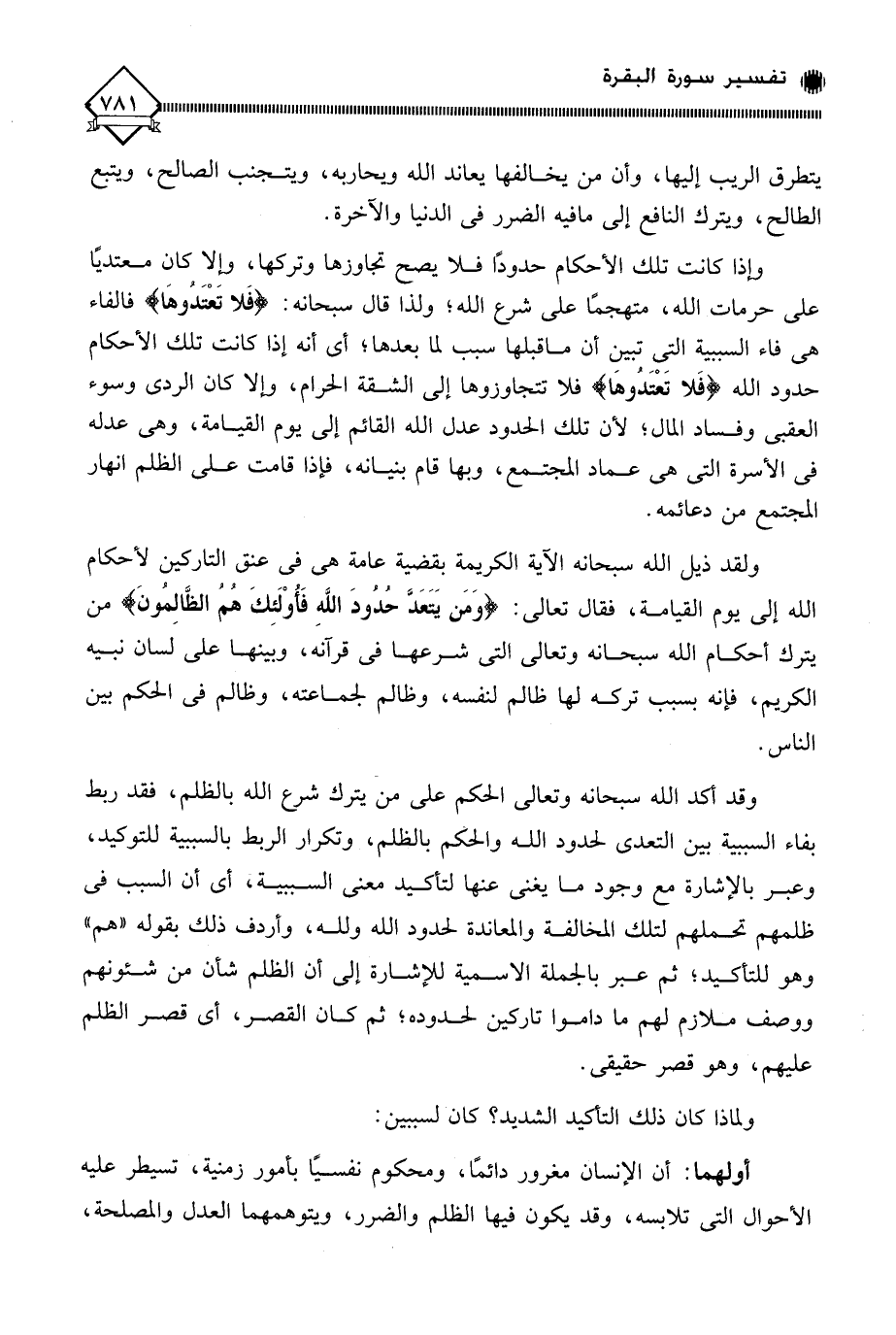 وإذا كانت تلك الأحكام حدودًا فلا يصح تجاوزها وتركها، وإلا كان معتديًا على حرمات الله، متهجمًا على شرع الله؛ ولذا قال سبحانه: (فَلا تَعْتَدوهَا) فالفاء هي فاء السببية التي تبين أن ما قبلها سبب لما بعدها؛ أي أنه إذا كانت تلك الأحكام حدود الله (فَلا تَعْتَدُوهَا) فلا تتجاوزوها إلى الشقة الحرام، وإلا كان الردى وسوء العقبى وفساد المال؛ لأن تلك الحدود عدل الله القائم إلى يوم القيامة، وهي عدله في الأسرة التي هي عماد المجتمع، وبها قام بنيانه، فإذا قامت على الظلم انهار المجتمع من دعائمه.
