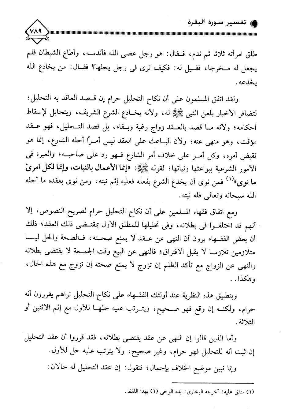 ولقد اتفق المسلمون على أن نكاح التحليل حرام إن قصد العاقد به التحليل " لتضافر الأخبار بلعن النبي - صلى الله عليه وسلم - له، ولأنه يخادع الشرع الشريف، ويتحايل لإسقاط أحكامه؛ ولأنه ما قصد بالعقد زواج رغبة وبقاء، بل قصد التحليل، فهو عقد مؤقت، وهو منهي عنه، ولأن الباعث على العقد ليس أمرًا أحله الشارع، إنما هو نقيض أمره، وكل أمر على خلاف أمر الشارع فهو رد على صاحبه، والعبرة في الأمور الشرعية ببواعثها ونياتها، لقوله - صلى الله عليه وسلم -: " إنما الأعمال بالنيات، وإنما لكل امرئ ما نوى " (¬1) فمن نوى أن يخدع الشرع بفعله فعليه إثم نيته، ومن نوى بعقده ما أحله الله سبحانه وتعالى فله نيته.