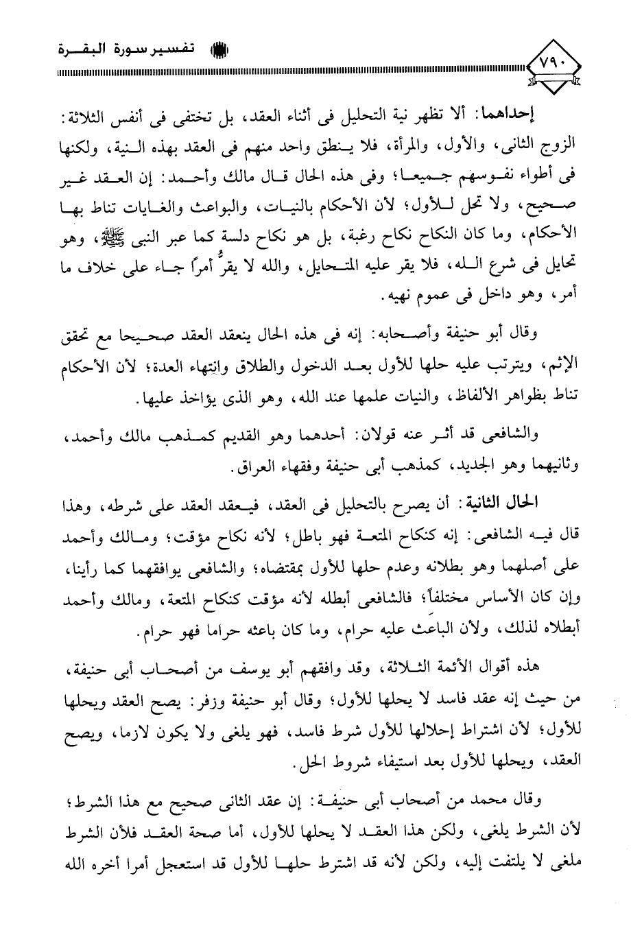إحداهم ألا تظهر نية التحليل في أثناء العقد، بل تختفي في أنفس الثلاثة الزوج الثاني، والأول، والمرأة، فلا ينطق واحد منهم في العقد بهذه النية، ولكنها في أطواء نفوسهم جميعا؛ وفي هذه الحال قال مالك وأحمد: إن العقد غير صحيح، ولا تحل للأول؛ لأن الأحكام بالنيات، والبواعث والغايات تناط بها الأحكام، وما كان النكاح نكاح رغبة، بل هو نكاح دلسة كما عبر النبي - صلى الله عليه وسلم -، وهو تحايل في شرع الله، فلا يقر عليه المتحايل، والله لَا يقر أمرًا جاء على خلاف ما أمر، وهو داخل في عموم نهيه.