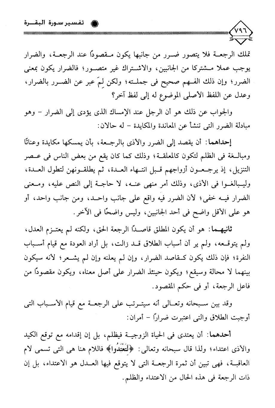 إحداهما: أن يقصد إلى الضرر والأذى بالرجعة، بأن يمسكها مكايدة وعناتًا ومبالغة في الظلم لتكون كالمعلقة؛ وذلك كما كان يقع من بعض الناس في عصر التنزيل، إذ يرجعون أزواجهم قبل انتهاء العدة، ثم يطلقونهن لتطول العدة، وليبالغوا في الأذى، وذلك أمر منهي عنه، لَا حاجة إلى النص عليه، ومعنى الضرار فيه خفي، لأن الضرر فيه واقع على جانب واحد، ومن جانب واحد، أو هو على الأقل واضح في أحد الجانبين، وليس واضحًا في الآخر.