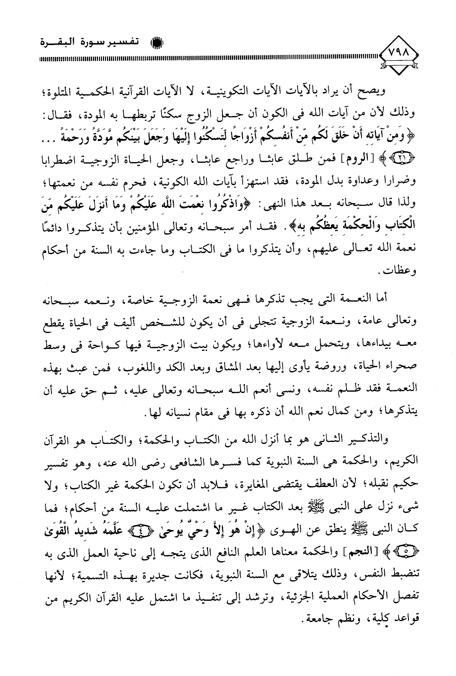 والتذكير الثاني هو بما أنزل الله من الكتاب والحكمة؛ والكتاب هو القرآن الكريم، والحكمة هي السنة النبوية كما فسرها الشافعي رضي الله عنه، وهو تفسير حكيم نقبله؛ لأن العطف يقتضي المغايرة، فلابد أن تكون الحكمة غير الكتاب؛ ولا شيء نزل على النبي - صلى الله عليه وسلم - بعد الكتاب غير ما اشتملت عليه السنة من أحكام؛ فما كان النبي - صلى الله عليه وسلم - ينطق عن الهوى (إِنْ هُوَ إِلَّا وَحْيٌ يُوحَى (4) عَلَّمَهُ شَدِيدُ الْقُوَى (5).