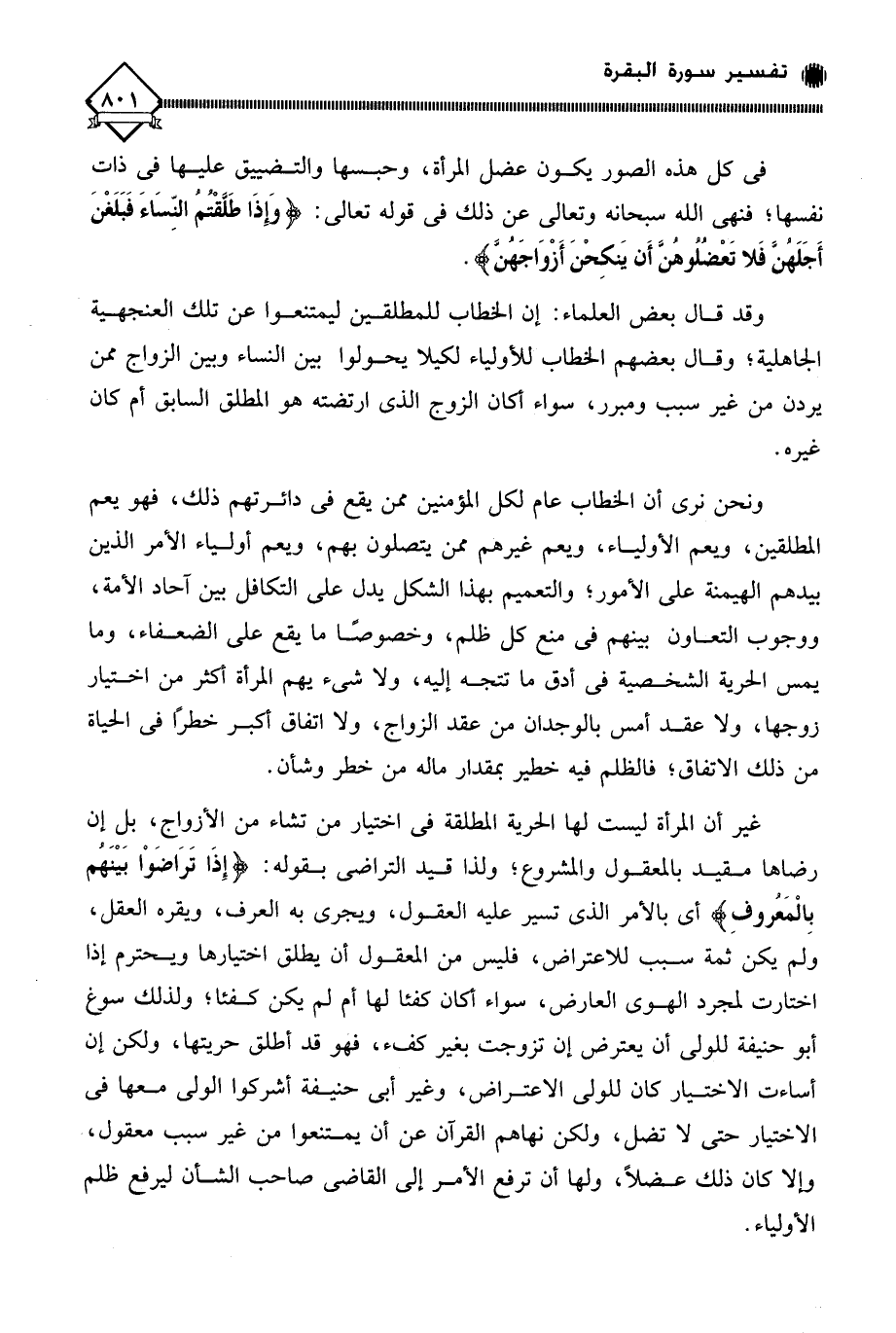 ونحن نرى أن الخطاب عام لكل المؤمنين ممن يقع في دائرتهم ذلك، فهو يعم المطلقين، ويعم الأولياء، ويعم غيرهم ممن يتصلون بهم، ويعم أولياء الأمر الذين بيدهم الهيمنة على الأمور، والتعميم بهذا الشكل يدل على التكافل بين آحاد الأمة، ووجوب التعاون بينهم في منع كل ظلم، وخصوصًا ما يقع على الضعفاء، وما يمس الحرية الشخصية في أدق ما تتجه إليه، ولا شيء يهم المرأة أكثر من اختيار زوجها، ولا عقد أمس بالوجدان من عقد الزواج، ولا اتفاق أكبر خطرًا في الحياة من ذلك الاتفاق؛ فالظلم فيه خطير بمقدار ماله من خطر وشأن.