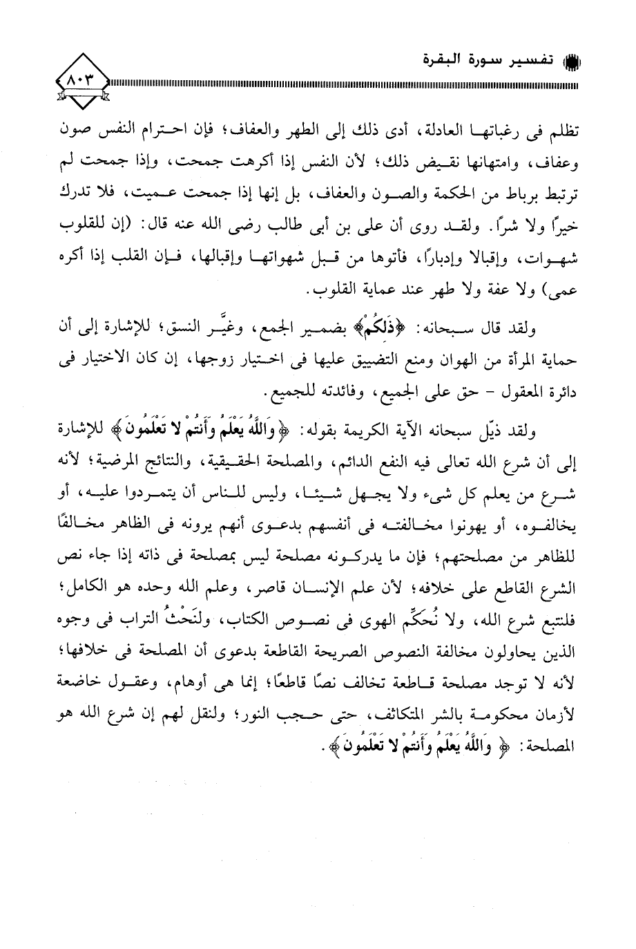 ولقد ذيل سبحانه الآية الكريمة بقوله: (وَاللَّه يَعْلَمُ وَأَنتُمْ لَا تَعْلَمُونَ) للإشارة إلى أن شرع الله تعالى فيه النفع الدائم، والمصلحة الحقيقية، والنتائج المرضية؛ لأنه شرع من يعلم كل شيء ولا يجهل شيئا، وليس للناس أن يتمردوا عليه، أو يخالفوه، أو يهونوا مخالفته في أنفسهم بدعوى أنهم يرونه في الظاهر مخالفًا للظاهر من مصلحتهم؛ فإن ما يدركونه مصلحة ليس بمصلحة في ذاته إذا جاء نص الشرع القاطع على خلافه؛ لأن علم الإنسان قاصر، وعلم الله وحده هو الكامل؛ فلنتبع شرع الله، ولا نُحكِّم الهوى في نصوص الكتاب، ولنَحْثُ التراب في وجوه الذين يحاولون مخالفة النصوص الصريحة القاطعة بدعوى أن المصلحة في خلافها؛ لأنه لَا توجد مصلحة قاطعة تخالف نصًا قاطعًا؛ إنما هي أوهام، وعقول خاضعة لأزمان محكومة بالشر المتكاثف، حتى حجب النور؛ ولنقل لهم إن شرع الله هو المصلحة: (وَاللَّهُ يَعْلَمُ وَأَنتُمْ لَا تَعْلَمُونَ).