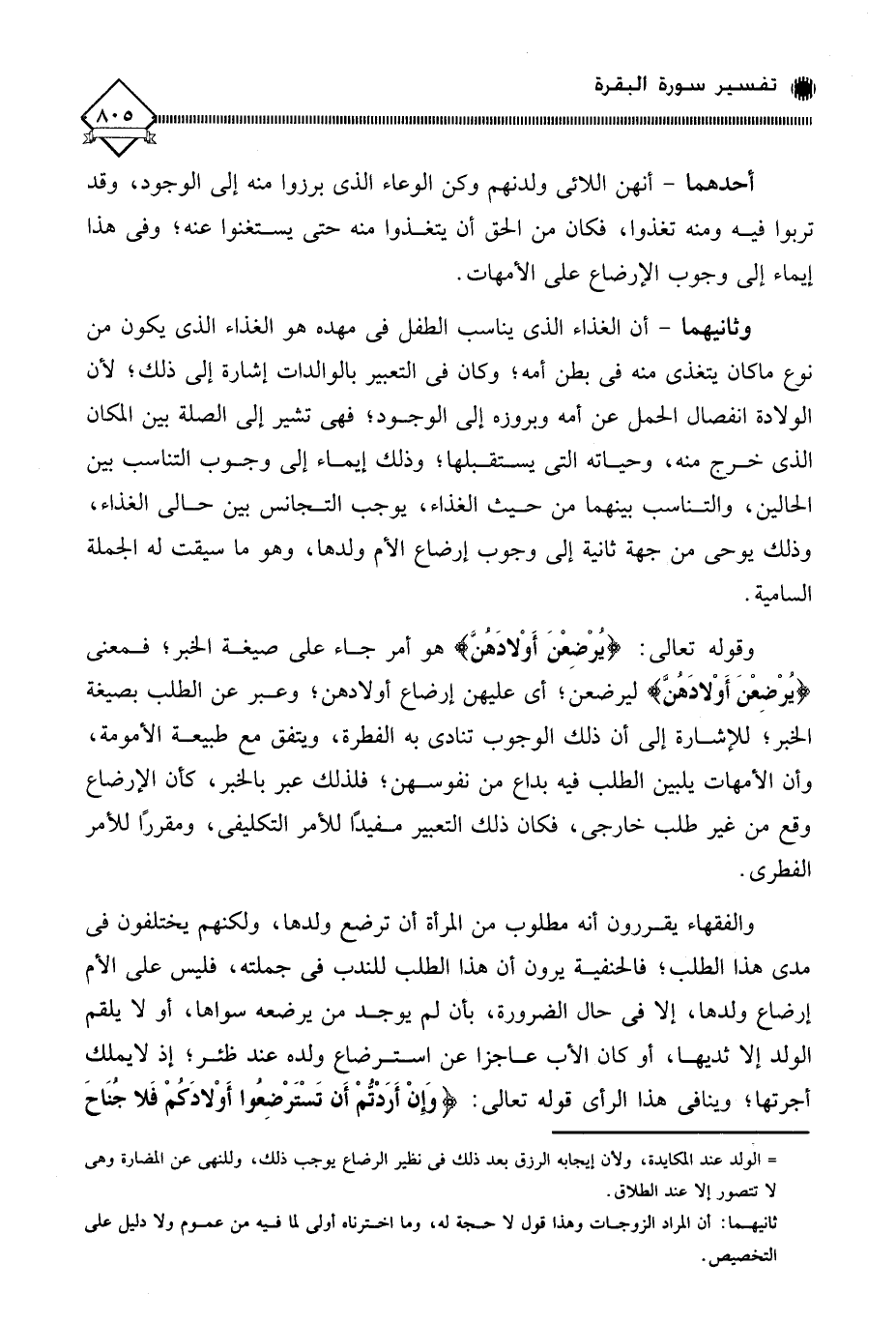 وثانيهما - أن الغذاء الذي يناسب الطفل في مهده هو الغذاء الذي يكون من نوع ماكان يتغذى منه في بطن أمه؛ وكان في التعبير بالوالدات إشارة إلى ذلك؛ لأن الولادة انفصال الحمل عن أمه وبروزه إلى الوجود؛ فهي تشير إلى الصلة بين المكان الذي خرج منه، وحياته التي يستقبلها؛ وذلك إيماء إلى وجوب التناسب بين الحالين، والتناسب بينهما من حيث الغذاء، يوجب التجانس بين حالي الغذاء، وذلك يوحي من جهة ثانية إلى وجوب إرضاع الأم ولدها، وهو ما سيقت له الجملة السامية.