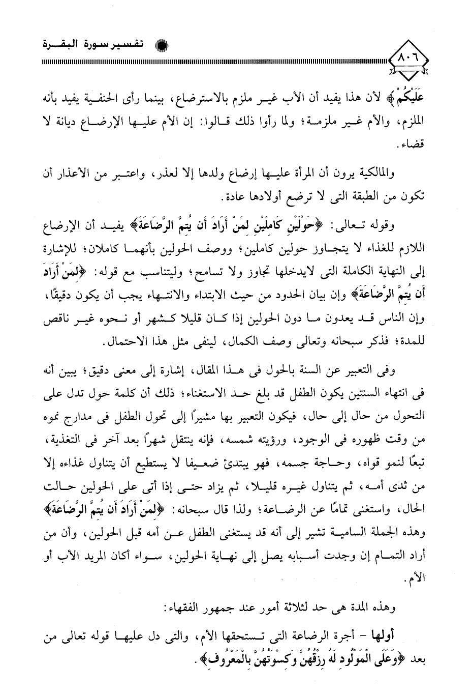 وقوله تعالى: (حَوْلَيْنِ كَامِلَيْنِ لِمَنْ أَرَادَ أَن يُتِمَّ الرَّضَاعَةَ) يفيد أن الإرضاع اللازم للغذاء لَا يتجاوز حولين كاملين، ووصف الحولين بأنهما كاملان، للإشارة إلى النهاية الكاملة التي لَا يدخلها تجاوز ولا تسامح، وليتناسب مع قوله: (لِمَنْ أَرَادَ أن يُتِمَّ الرَّضَاعَةَ) وإن بيان الحدود من حيث الابتداء والانتهاء يجب أن يكون دقيقًا، وإن الناس قد يعدون ما دون الحولين إذا كان قليلا كشهر أو نحوه غير ناقص للمدة، فذكر سبحانه وتعالى وصف الكمال، لينفي مثل هذا الاحتمال).