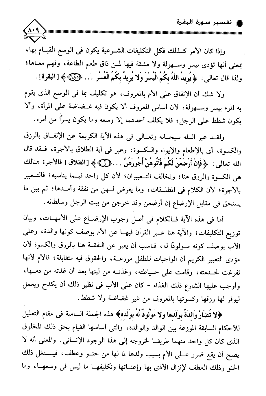 (لا تُضَارَ وَالِدَةٌ بِوَلَدِهَا وَلا مَولودٌ لهُ بِوَلَدِهِ) هذه الجملة السامية في مقام التعليل للأحكام السابقة الموزعة بين الوالد والوالدة، والتي أساسها القيام بحق ذلك المخلوق الذي كان كل واحد منهما طريقا لخروجه إلى هذا الوجود الإنساني. والمعنى أنه لا يصح أن يقع ضرر على الأم بسبب ولدها لما لها من حنو وعطف، فيستغل ذلك الحنو وذلك العطف لإنزال الأذى بها وإعناتها وتكليفها ما ليس في وسعها، وما