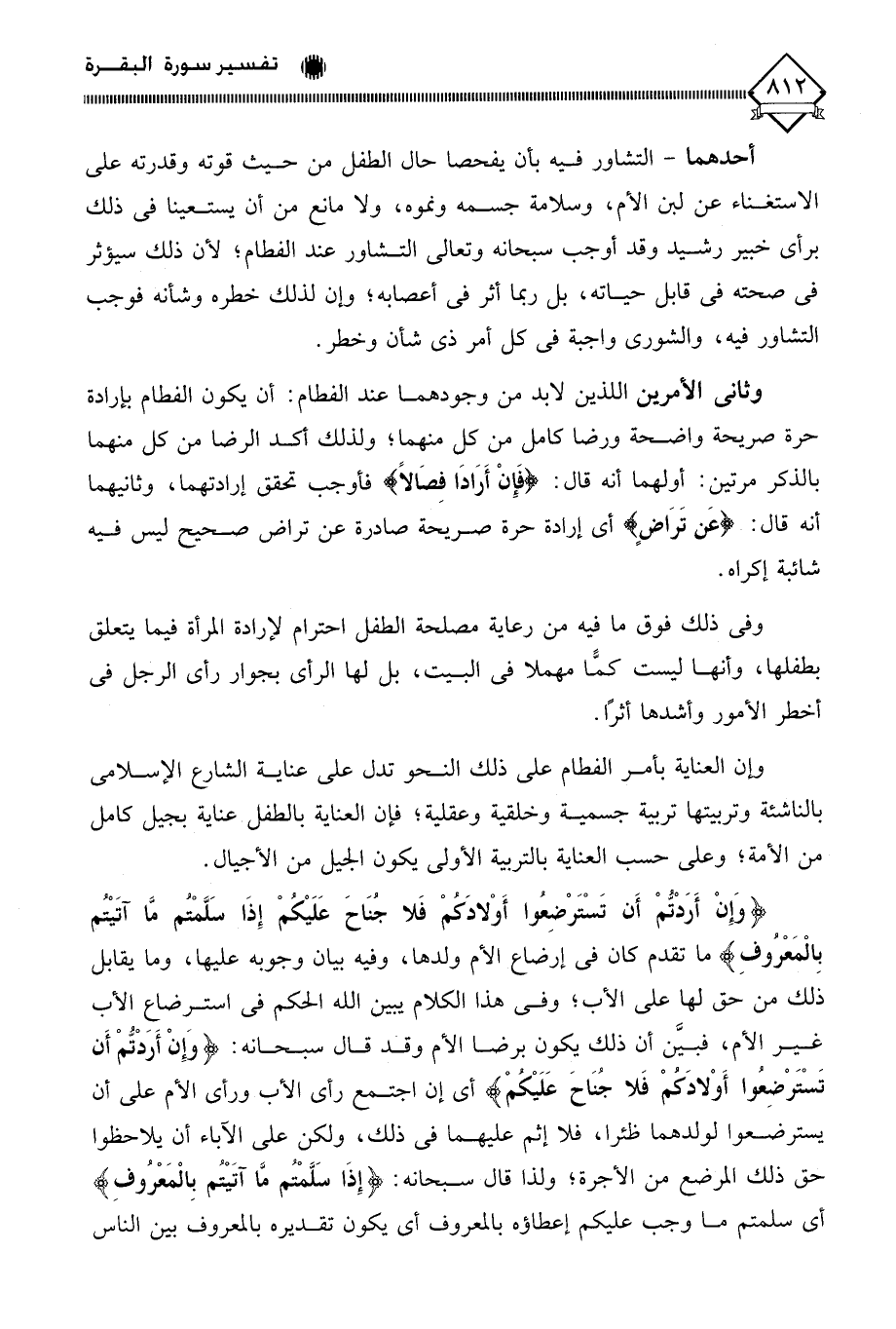 أحدهما - التشاور فيه بأن يفحصحا حال الطفل من حيث قوته وقدرته على الاستغناء عن لبن الأم، وسلامة جسمه ونموه، ولا مانع من أن يستعينا في ذلك برأى خبير رشيد وقد أوجب سبحانه وتعالى التشاور عند الفطام، لأن ذلك سيؤثر في صحته في قابل حياته، بل ربما أثر في أعصابه؛ وإن لذلك خطره وشأنه فوجب التشاور فيه، والشورى واجبة في كل أمر ذي شأن وخطر.