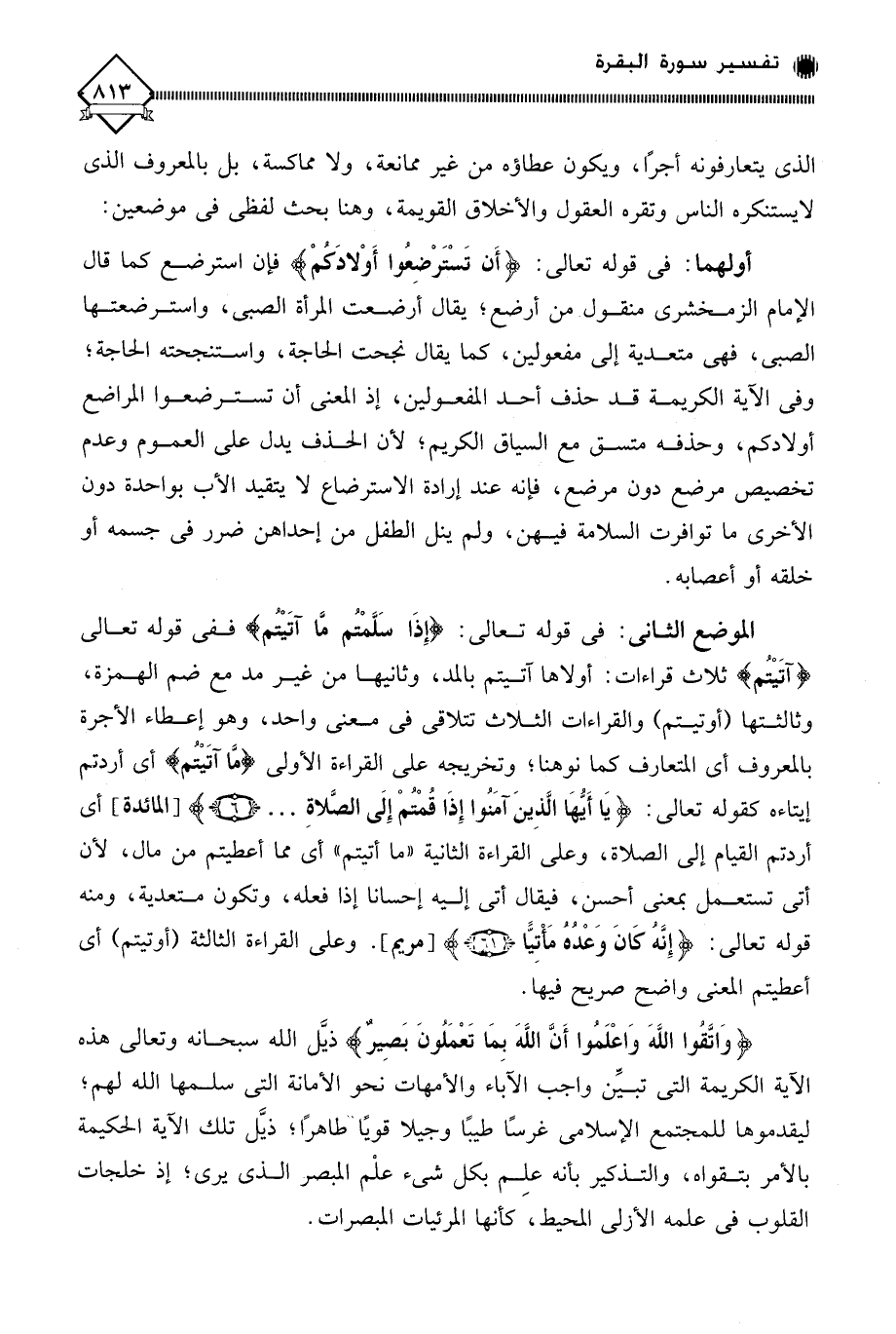 الموضع الثاني: في قوله تعالى: (إِذَا سَلَّمْتُم مَّا آتَيْتُم) ففي قوله تعالى (آتَيْتُم) ثلاث قراءات: أولاها آتيتم بالمد، وثانيها من غير مد مع ضم الهمزة، وثالثتها (أوتيتم) والقراءات الثلاث تتلاقى في معنى واحد، وهو إعطاء الأجرة بالمعروف أي المتعارف كما نوهنا؛ وتخريجه على القراءة الأولى (مَّا آتَيْتُم) أي أردتم إيتاءه كقوله تعالى: (يَا أَيُّهَا الَّذِينَ آمَنُوا إِذَا قُمْتُمْ إِلَى الصَّلاةِ. . .) أي أردتم القيام إلى الصلاة، وعلى القراءة الثانية " ما أتيتم " أي مما أعطيتم من مال، لأن أتى تستعمل بمعنى أحسن، فيقال أتى إليه إحسانا إذا فعله، وتكون متعدية، ومنه قوله تعالى: (إِنَّهُ كَانَ وَعْدُة مَأتِيًّا -). وعلى القراءة الثالثة (أوتيتم) أي أعطيتم المعنى واضح صريح فيها.
