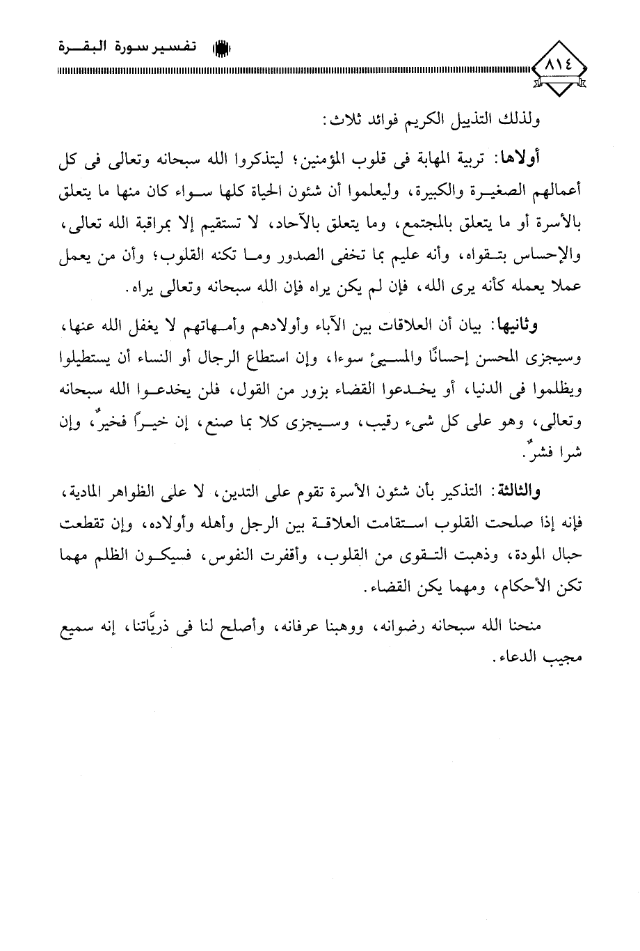 والثالثة: التذكير بأن شئون الأسرة تقوم على التدين، لَا على الظواهر المادية، فإنه إذا صلحت القلوب استقامت العلاقة بين الرجل وأهله وأولاده، وإن تقطعت حبال المودة، وذهبت التقوى من القلوب، وأقفرت النفوس، فسيكون الظلم مهما تكن الأحكام، ومهما يكن القضاء.