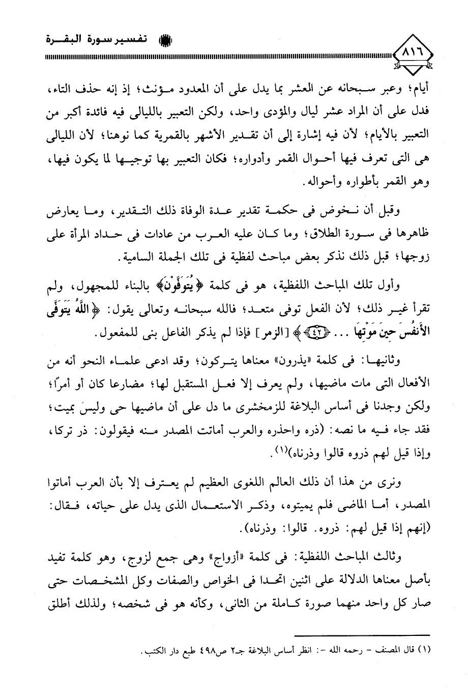 وأول تلك المباحث اللفظية، هو في كلمة (يُتَوَفَوْنَ) بالبناء للمجهول، ولم تقرأ غير ذلك؛ لأن الفعل توفى متعد؛ فالله سبحانه وتعالى يقول: (اللَّهُ يَتَوَفَى الأَنفُسَ حِينَ مَوْتِهَا. . .)، فإذا لم يذكر الفاعل بني للمفعول.