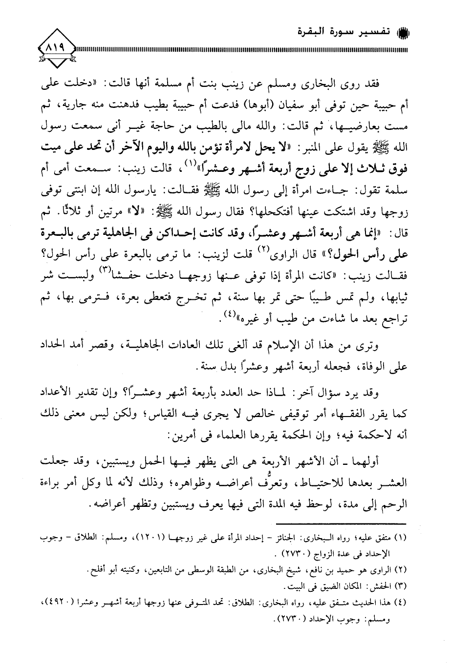 (¬4) هذا الحديث متفق عليه، رواه البخاري: الطلاق: تحد اتموفى عنها زوجها أربعة أشهر وعشرا (4920)، ومسلم: وجوب الإحداد (2730).