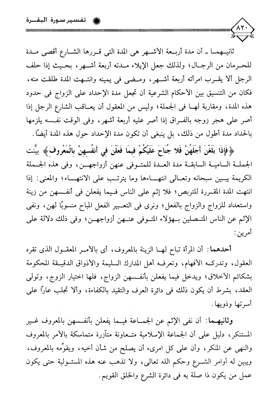 وثانيهما: أن نفي الإثم عن الجماعة فيما يفعلن بأنفسهن بالمعروف غير المستنكر، دليل على أن الجماعة الإسلامية متعاونة متآزرة متماسكة بالأمر بالمعروف والنهي عن المنكر، وأن على كل امرئ أن يصلح من شأن أخيه، ويقوِّمه بالمعروف، ويبين له أوامر الشرع وحكم الله تعالى، ولا تذهب عنه هذه المسئولية حتى يكون عمل من يكون ذا صلة به في دائرة الشرع والخلق القويم.