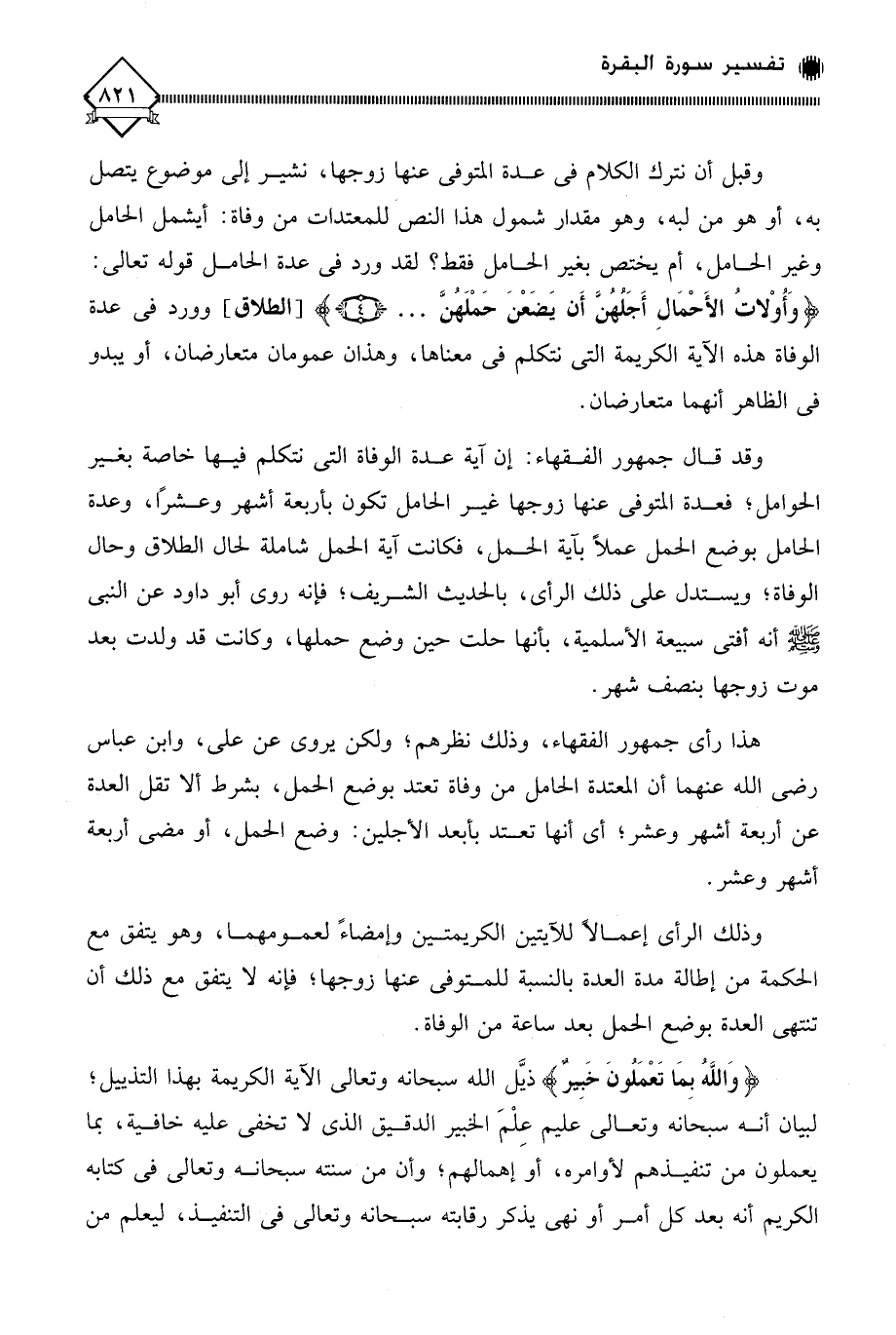 وقد قال جمهور الفقهاء: إن آية عدة الوفاة التي نتكلم فيها خاصة بغير الحوامل، فعدة المتوفى عنها زوجها غير الحامل تكون بأربعة أشهر وعشرًا، وعدة الحامل بوضع الحمل عملًا بآية الحمل، فكانت آية الحمل شاملة لحال الطلاق وحال الوفاة؛ ويستدل على ذلك الرأي، بالحديث الشريف؛ فإنه روى أبو داود عن النبي - صلى الله عليه وسلم - أنه أفتى سبيعة الأسلمية، بأنها حلت حين وضع حملها، وكانت قد ولدت بعد موت زوجها بنصف شهر.