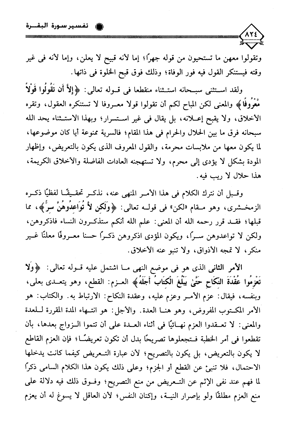 الأمر الثاني الذي هو في موضع النهي ما اشتمل عليه قوله تعالى: (وَلا تَعْزِمُوا عُقْدَةَ النِّكَاحِ حَتَّى يَبْلُغَ الْكِتَابُ أَجَلَهُ) العزم: القطع، وهو يتعدى بعلى، وبنفسه، فيقال: عزم الأمر وعزم عليه، وعقدة النكاح: الارتباط به. والكتاب: هو الأمر المكتوب المفروض، وهو هنا العدة. والأجل: هو انتهاء المدة المقررة للعدة والمعنى: لَا تعقدوا العزم نهائيًا في أثناء العدة على أن تتموا الزواج بعدها، بأن تقطعوا في أمر الخطبة فتجعلوها تصريحًا بدل أن تكون تعريضًا؛ فإن العزم القاطع لا يكون بالتعريض، بل يكون بالتصريح؛ لأن عبارة التعريض كيفما كانت يدخلها الاحتمال، فلا تنبئ عن القطع أو الجزم؛ وعلى ذلك يكون هذا الكلام السامي ذكرًا لما فهم عند نفي الإثم عن التعريض من منع التصريح؛ وفوق ذلك فيه دلالة على