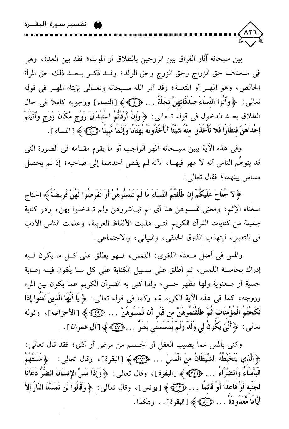 (لَا جُنَاحَ عَلَيْكُمْ إِنْ طَلَّقْتُمُ النِّسَاءَ مَا لَمْ تَمَسُّوهُنَّ أَوْ تَفْرِضُوا لَهُنَّ فَرِيضَةً) الجناح معناه الإثم، ومعنى تمسوهن هنا أي لم تباشروهن ولم تدخلوا بهن، وهو كناية جميلة من كنايات القرآن الكريم التي هذبت الألفاظ العربية، وعلمت الناس الأدب في التعبير، ليتهذب الذوق الخلقي، والبياني، والاجتماعي.