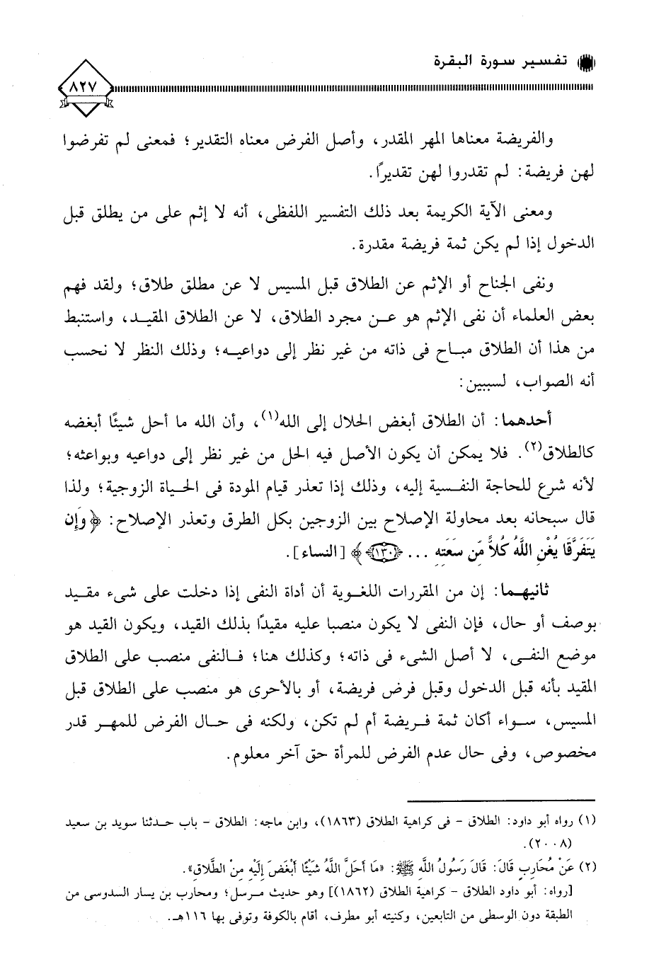 ونفي الجناح أو الإثم عن الطلاق قبل المسيس لَا عن مطلق طلاق؛ ولقد فهم بعض العلماء أن نفي الإثم هو عن مجرد الطلاق، لَا عن الطلاق المقيد، واستنبط من هذا أن الطلاق مباح في ذاته من غير نظر إلى دواعيه؛ وذلك النظر لَا نحسب أنه الصواب، لسببين: