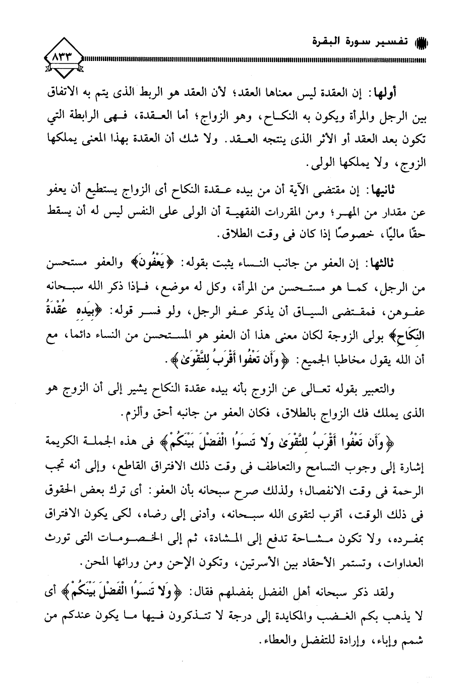 ثالثها: إن العفو من جانب النساء يثبت بقوله: (يَعْفونَ) والعفو مستحسن من الرجل، كما هو مستحسن من المرأة، وكل له موضع، فإذا ذكر الله سبحانه عفوهن، فمقتضى السياق أن يذكر عفو الرجل، ولو فسر قوله: (بِيَدِهِ عُقْدَةُ النِّكَاحِ) بولي الزوجة لكان معنى هذا أن العفو هو المستحسن من النساء دائما، مع أن الله يقول مخاطبا الجميع: (وَأَن تَعْفُوا أَقْرَب لِلتَّقْوَى).