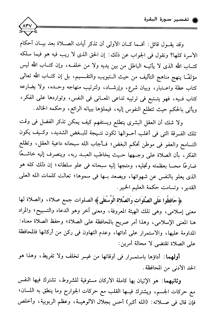 وقد يقول قائل: أفما كان الأولى أن تذكر آيات الصلاة بعد بيان أحكام الأسرة كلها؟ ونقول في الجواب عن ذلك: إن الحق الذي لَا ريب فيه هو فيما سلكه كتاب الله الذي لَا يأتيه الباطل من بين يديه ولا من خلفه، وإن كتاب الله ليس مؤلفًا ينهج مناهج التأليف من حيث التبويب والتقسيم، بل إن كتاب الله تعالى كتاب عظة واعتبار، وبيان شرع، وإرشاد، ولترتيب منهاجه وحده، ولا يضارعه كتاب فيه، فهو يتتبع في ترتيبه تداعي المعاني في النفس، وتواردها على الفكر، ويأتي بالحكم حيث تتطلع النفوس إليه، فيملؤها ببيانه الرائع، وحكمه الخالد.