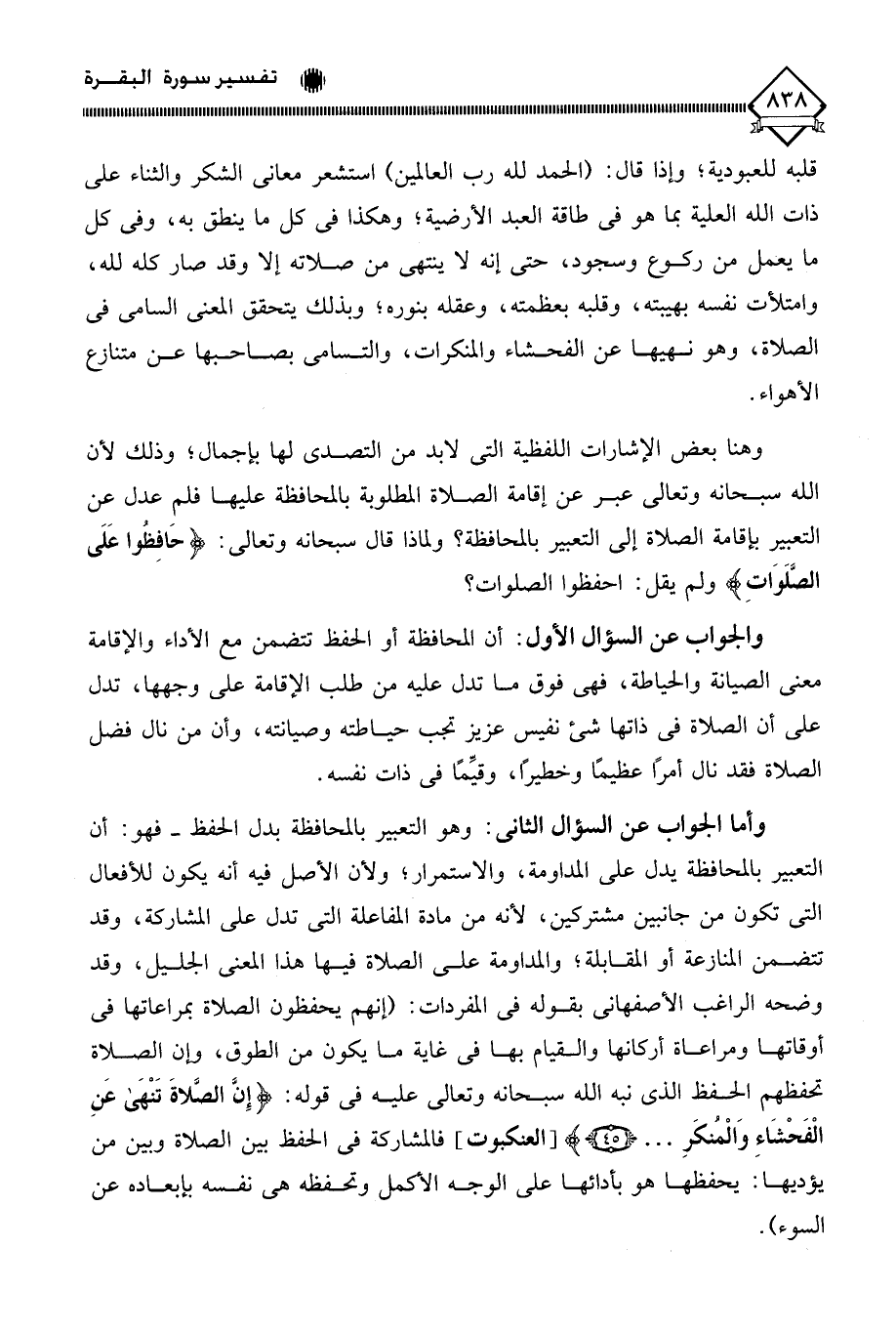 والجواب عن السؤال الأول: أن المحافظة أو الحفظ تتضمن مع الأداء والإقامة معنى الصيانة والحياطة، فهي فوق ما تدل عليه من طلب الإقامة على وجهها، تدل على أن الصلاة في ذاتها شيء نفيس عزيز تجب حياطته وصيانته، وأن من نال فضل الصلاة فقد نال أمرًا عظيمًا وخطيرًا، وقيِّمًا في ذات نفسه.