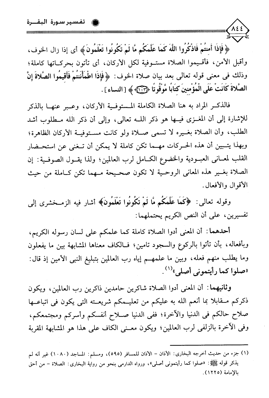 (فَإِذَا أَمِنْتُمْ فَاذْكُرُوا اللَّهَ كَمَا عَلَّمَكُمْ مَا لَمْ تَكُونُوا تَعْلَمُونَ) أي إذا زال الخوف، وأقبل الأمن، فأقيموا الصلاة مستوفية لكل الأركان، أي تأتون بحركاتها كاملة؛ وذلك في معنى قوله تعالى بعد بيان صلاة الخوف: (فَإِذَا اطْمَأنَنتُمْ فَأَقِيمُوا الصَّلاةَ إِنَّ الصَّلاةَ كَانَتْ عَلَى الْمُؤْمِنِينَ كتَابًا مَّوْقُوتًا).