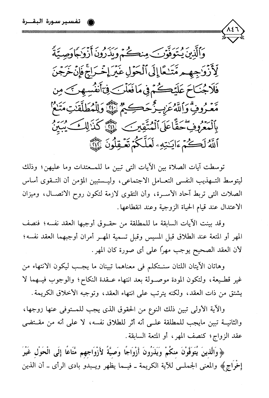 (وَالَّذِينَ يُتَوَفَّوْنَ مِنْكُمْ وَيَذَرُونَ أَزْوَاجًا وَصِيَّةً لِأَزْوَاجِهِمْ مَتَاعًا إِلَى الْحَوْلِ غَيْرَ إِخْرَاجٍ فَإِنْ خَرَجْنَ فَلَا جُنَاحَ عَلَيْكُمْ فِي مَا فَعَلْنَ فِي أَنْفُسِهِنَّ مِنْ مَعْرُوفٍ وَاللَّهُ عَزِيزٌ حَكِيمٌ (240) وَلِلْمُطَلَّقَاتِ مَتَاعٌ بِالْمَعْرُوفِ حَقًّا عَلَى الْمُتَّقِينَ (241) كَذَلِكَ يُبَيِّنُ اللَّهُ لَكُمْ آيَاتِهِ لَعَلَّكُمْ تَعْقِلُونَ (242)