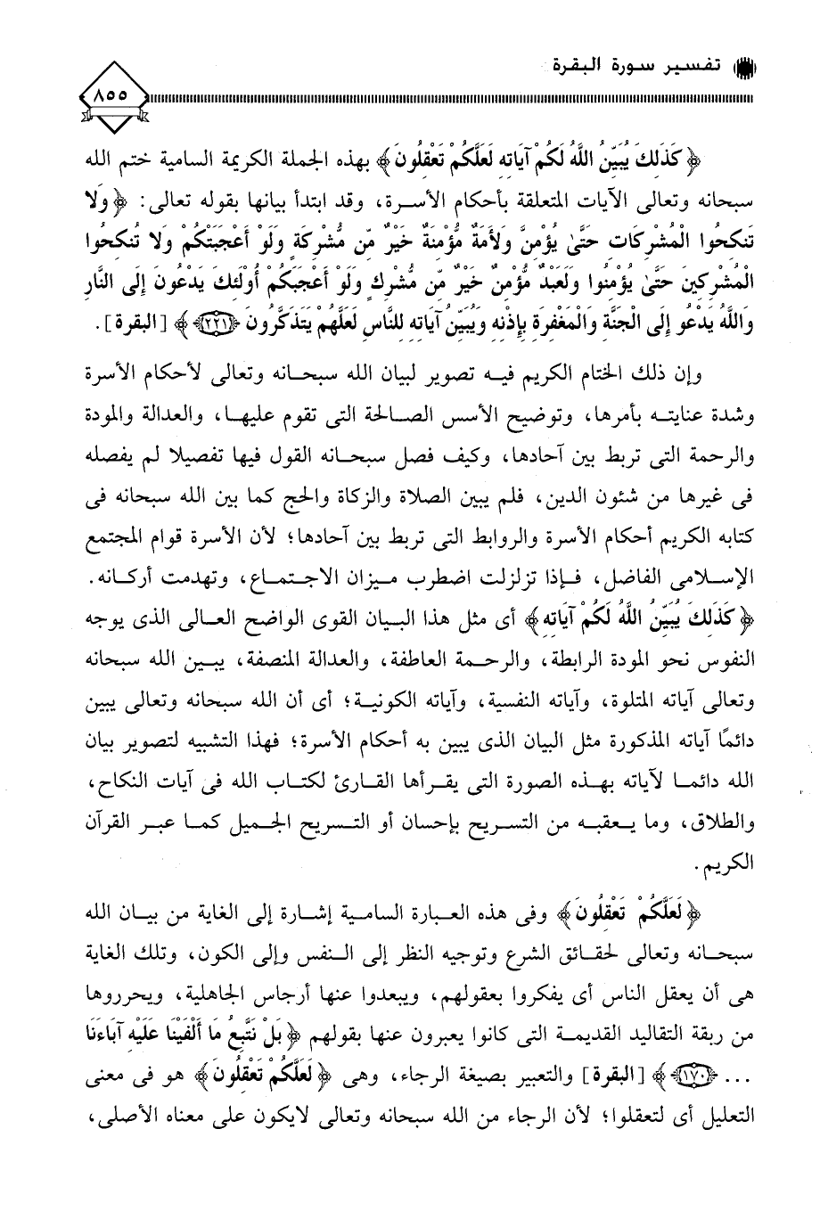 (كَذَلِكَ يُبَيِّنُ اللَّهُ لَكُمْ آيَاتِه لَعَلَّكُمْ تَعْقِلُونَ) بهذه الجملة الكريمة السامية ختم الله سبحانه وتعالى الآيات المتعلقة بأَحكام الأسرة، وقد ابتدأ بيانها بقوله تعالى: (وَلَا تَنْكِحُوا الْمُشْرِكَاتِ حَتَّى يُؤْمِنَّ وَلَأَمَةٌ مُؤْمِنَةٌ خَيْرٌ مِنْ مُشْرِكَةٍ وَلَوْ أَعْجَبَتْكُمْ وَلَا تُنْكِحُوا الْمُشْرِكِينَ حَتَّى يُؤْمِنُوا وَلَعَبْدٌ مُؤْمِنٌ خَيْرٌ مِنْ مُشْرِكٍ وَلَوْ أَعْجَبَكُمْ أُولَئِكَ يَدْعُونَ إِلَى النَّارِ وَاللَّهُ يَدْعُو إِلَى الْجَنَّةِ وَالْمَغْفِرَةِ بِإِذْنِهِ وَيُبَيِّنُ آيَاتِهِ لِلنَّاسِ لَعَلَّهُمْ يَتَذَكَّرُونَ (221).