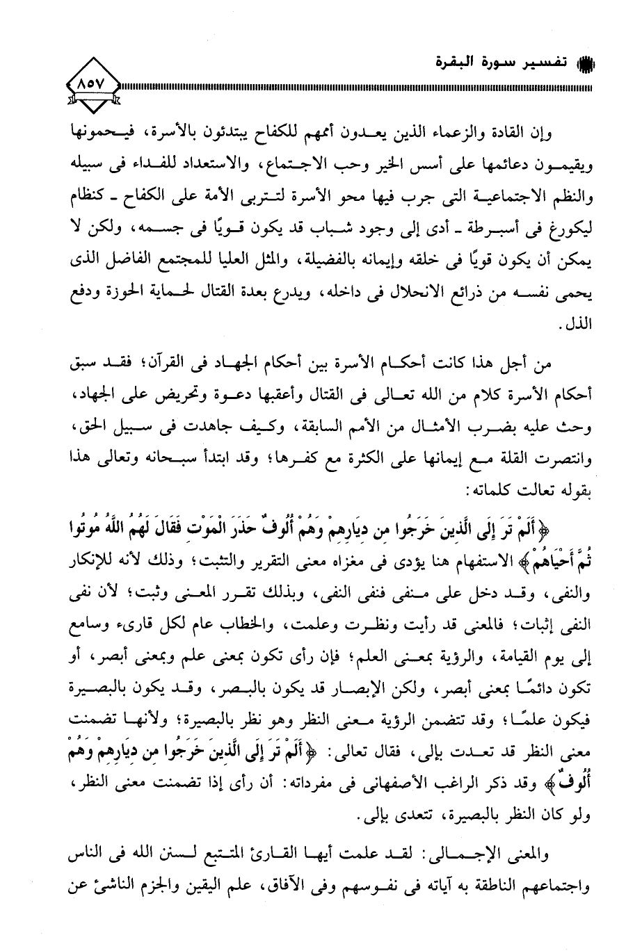 (أَلَمْ تَرَ إِلَى الَّذِينَ خَرَجُوا مِن دِيَارِهِمْ وَهُمْ أُلُوفٌ حَذَرَ الْمَوْتِ فَقَالَ لَهُمُ اللَّهُ مُوتُوا ثُمَّ أَحْيَاهُمْ) الاستفهام هنا يؤدي في مغزاه معنى التقرير والتثبت؛ وذلك لأنه للإنكار والنفي، وقد دخل على منفي فنفَى النفي، وبذلك تقرر المعنى وثبت؛ لأن نفي النفي إثبات؛ فالمعنى قد رأيت ونظرت وعلمت، والخطاب عام لكل قارئ وسامع إلى يوم القيامة، والرؤية بمعنى العلم؛ فإن رأى تكون بمعنى علم وبمعنى أبصر، أو تكون دائما بمعنى أبصر، ولكن الإبصار قد يكون بالبصر، وقد يكون بالبصيرة فيكون علمًا؛ وقد تتضمن الرؤية معنى النظر وهو نظر بالبصيرة؛ ولأنها تضمنت معنى النظر قد تعدت بإلى، فقال تعالى: (أَلَمْ تَرَ إِلَى الَّذِينَ خَرَجُوا مِن دِيَارِهِمْ وَهُمْ أُلُوفٌ) وقد ذكر الراغب الأصفهاني في مفرداته: أن رأى إذا تضمنت معنى النظر، ولو كان النظر بالبصيرة، تتعدى بإلى.
