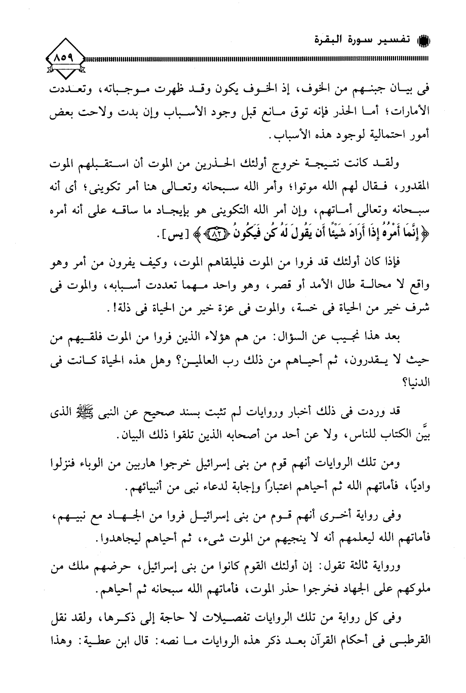 وفى رواية أخرى أنهم قوم من بني إسرائيل فروا من الجهاد مع نبيهم، فأماتهم الله ليعلمهم أنه لَا ينجيهم من الموت شيء، ثم أحياهم ليجاهدوا.