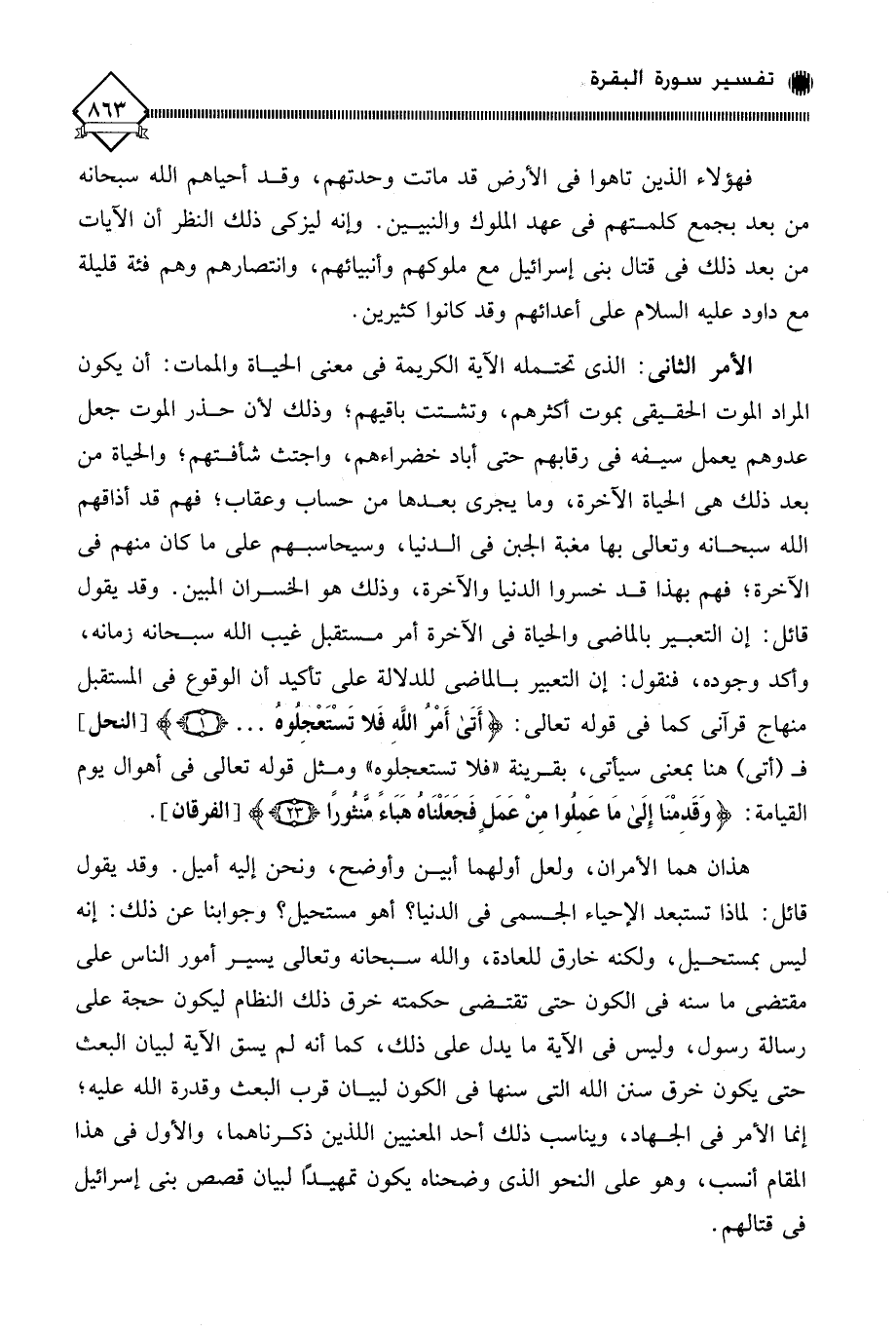 هذان هما الأمران، ولعل أولهما أبين وأوضح، ونحن إليه أميل. وقد يقول قائل: لماذا تستبعد الإحياء الجسمي في الدنيا؟ أهو مستحيل؟ وجوابنا عن ذلك: إنه ليس بمستحيل، ولكنه خارق للعادة، والله سبحانه وتعالى يسير أمور الناس على مقتضى ما سنه في الكون حتى تقتضي حكمته خرق ذلك النظام ليكون حجة على رسالة رسول، وليس في الآية ما يدل على ذلك، كما أنه لم يسق الآية لبيان البعث حتى يكون خرق سنن الله التي سنها في الكون لبيان قرب البعث وقدرة الله عليه؛ إنما الأمر في الجهاد، ويناسب ذلك أحد المعنيين اللذين ذكرناهما، والأول في هذا المقام أنسب، وهو على النحو الذي وضحناه يكون تمهيدًا لبيان قصص بني إسرائيل في قتالهم.