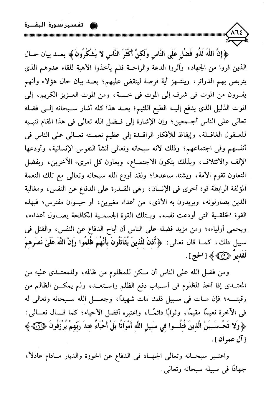 (إِنَّ اللَّهَ لَذُو فَضْلٍ عَلَى النَّاسِ وَلَكِنَّ أَكْثَرَ النَّاسِ لَا يَشْكُرُونَ) بعد بيان حال الذين فروا من الجهاد، وآثروا الدعة والراحة فلم يأخذوا الأهبة للقاء عدوهم الذي يتربص بهم الدوائر، وينتهز أية فرصة لينقض عليهم؛ بعد بيان حال هؤلاء وأنهم يفرون من الموت في شرف إلى الموت في خسة، ومن الموت العزيز الكريم، إلى الموت الذليل الذي يدفع إليه الطبع اللئيم؛ بعد هذا كله أشار سبحانه إلى فضله تعالى على الناس أجمعين؛ وإن الإشارة إلى فضل الله تعالى في هذا المقام تنبيه للعقول الغافلة، وإيقاظ للأفكار الراقدة إلى عظيم نعمته تعالى على الناس في أنفسهم وفي اجتماعهم؛ وذلك لأنه سبحانه وتعالى أنشا النفوس الإنسانية، وأودعها الإلف والائتلاف، وبذلك يتكون الاجتماع، ويعاون كل امرئ الآخرين، وبفضل التعاون تقوم الأمة، ويشتد ساعدها، ولقد أوح الله سبحانه وتعالى مع تلك النعمة المؤلفة الرابطة قوة أخرى في الإنسان، وهي القدرة على الدفاع عن النفس، ومغالبة الذين يصاولونه، ويريدون به الأذى، من أعداء مغيرين، أو حيوان مفترس؛ فبهذه القوة الخلقية التي أودعت نفسه، وبتلك القوة الجسمية المكافحة يصاول أعداءه، ويحمي أولياءه، ومن مزيد فضله على الناسِ أن أباح الدفاع عن النفس، والقتل في سبيل ذلك، كما قال تعالى: (أُذِنَ لِلَّذِينَ يُقَاتَلُونَ بِأَنَّهُمْ ظُلِمُوا وَإِنَّ اللَّهَ عَلَى نَصْرِهِمْ لَقَدِيرٌ).