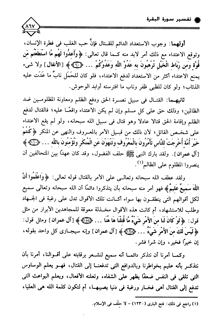 أولهما: وجوب الاستعداد الدائم للقتال فإن حب الغلب في فطرة الإنسان، وتوقع الاعتداء مع ذلك أمر لابد منه كما قال تعالى: (وَأَعدُّوا لَهُم مَّا اسْتَطَعْتُم مِّن قُوَّة ومِن رِّبَاطِ الْخَيْلِ تُرْهِبُونَ بِهِ عَدُوَّ اللَّهِ وَعَدُوَّكمْ. . .)، ولا شيء يمنع الاعتداء أكثر من الاستعداد لدفع الاعتداء، فلو كان للحَمَل نابٌ ما عَدَت عليه الذئاب؛ ولو كان للظبي ظفر وناب ما افترسته أوابد الوحوش.