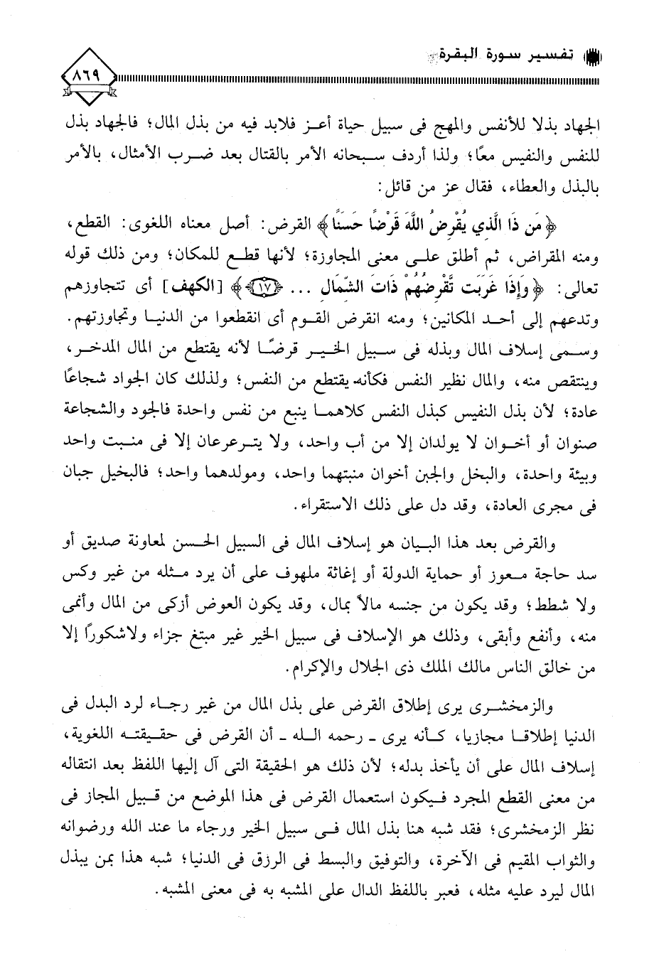 والزمخشري يرى إطلاق القرض على بذل المال من غير رجاء لرد البدل في الدنيا إطلاقا مجازيا، كأنه يرى - رحمه الله - أن القرض في حقيقته اللغوية، إسلاف المال على أن يأخذ بدله، لأن ذلك هو الحقيقة التي آل إليها اللفظ بعد انتقاله من معنى القطع المجرد فيكون استعمال القرض في هذا الموضع من قبيل المجاز في نظر الزمخشري، فقد شبه هنا بذل المال في سبيل الخير ورجاء ما عند الله ورضوانه والثواب القيم في الآخرة، والتوفيق والبسط في الرزق في الدنيا؛ شبه هذا بمن يبذل المال ليرد عليه مثله، فعبر باللفظ الدال على المشبه به في معنى المشبه.