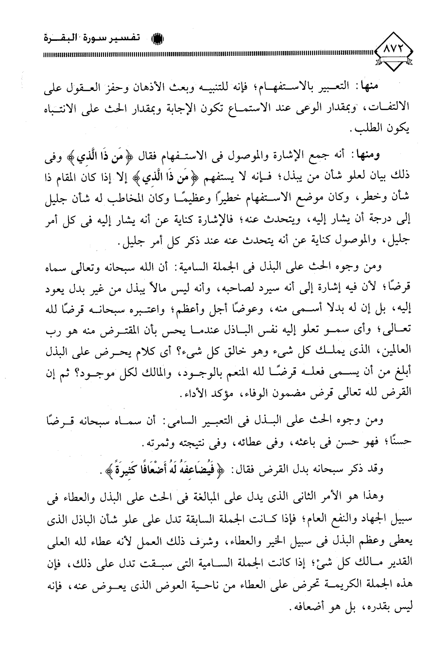 ومنها: أنه جمع الإشارة والموصول في الاستفهام فقال (مَن ذَا الَّذِي) وفي ذلك بيان لعلو شأن من يبذل، فإنه لَا يستفهم (مَن ذَا الَّذِي) إلا إذا كان المقام ذا شأن وخطر، وكان موضع الاستفهام خطيرًا وعظيمًا وكان المخاطب له شأن جليل إلى درجة أن يشار إليه، ويتحدث عنه، فالإشارة كناية عن أنه يشار إليه في كل أمر جليل، والموصول كناية عن أنه يتحدث عنه عند ذكر كل أمر جليل.