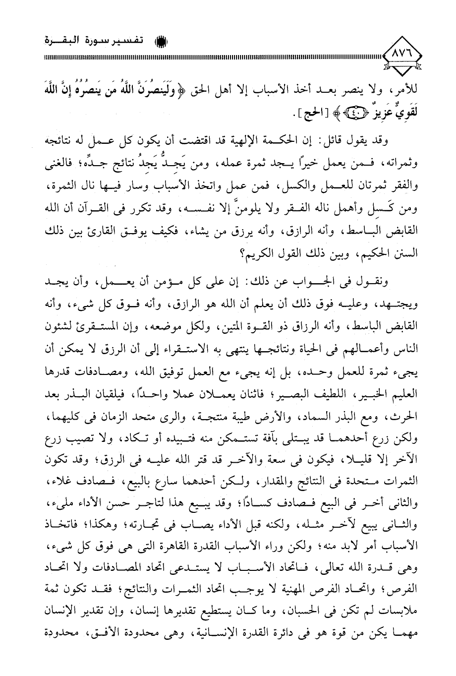 وقد يقول قائل: إن الحكمة الإلهية قد اقتضت أن يكون كل عمل له نتائجه وثمراته، فمن يعمل خيرًا يجد ثمرة عمله، ومن يَجِدُّ يَجِدُ نتائج جده، فالغنى والفقر ثمرتان للعمل والكسل، فمن عمل واتخذ الأسباب وسار فيها نال الثمرة، ومن كَسِل وأهمل ناله الفقر ولا يلومنَّ إلا نفسه، وقد تكرر في القرآن أن الله القابض الباسط، وأنه الرازق، وأنه يرزق من يشاء، فكيف يوفق القارئ بين ذلك السنن الحكيم، وبين ذلك القول الكريم؟