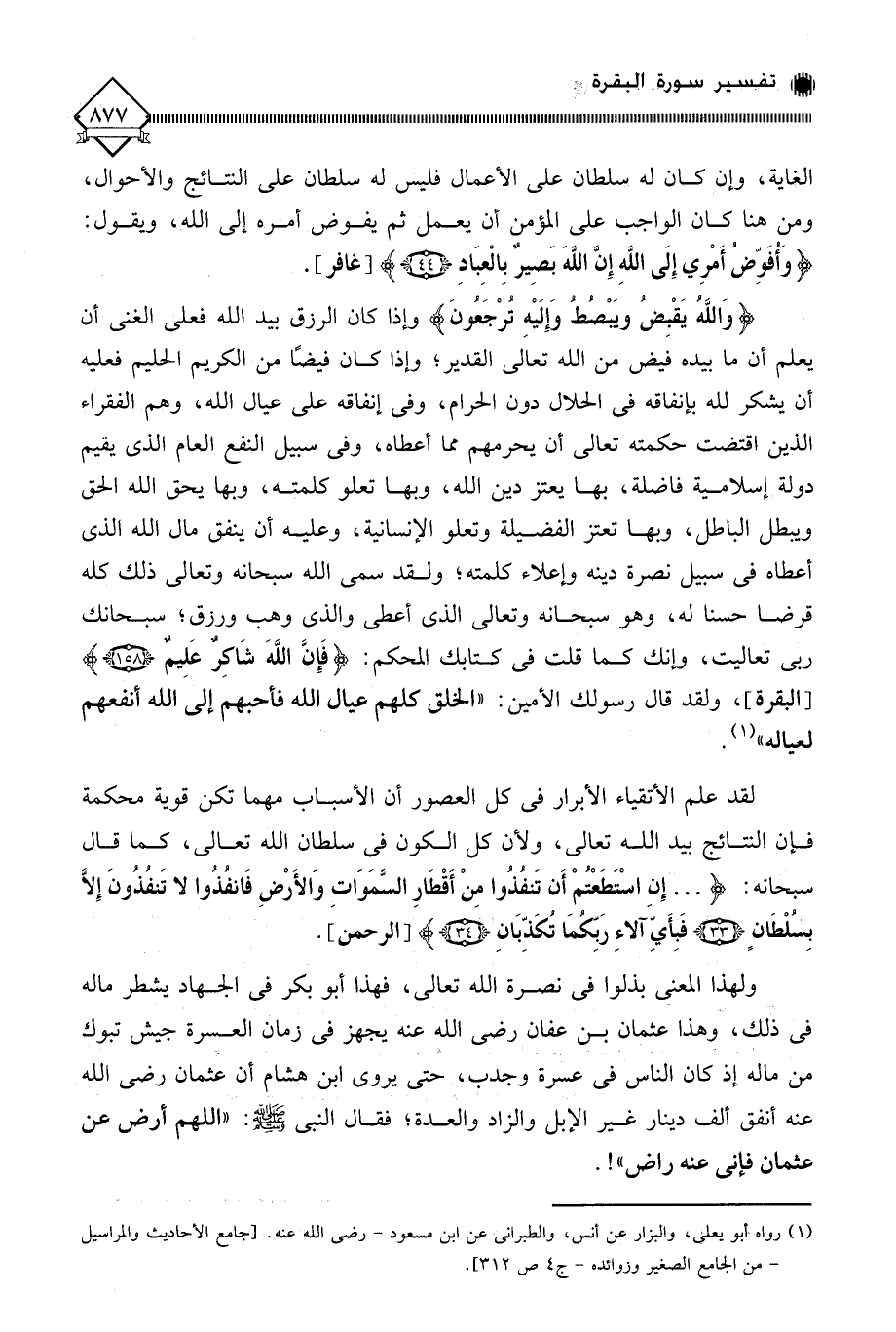 (وَاللَّهُ يَقْبِضُ ويَبْصُطُ وَإِلَيْه تُرْجَعُونَ) وإذا كان الرزق بيد الله فعلى الغني أن يعلم أن ما بيده فيض من الله تعالى القدير؛ وإذا كان فيضًا من الكريم الحليم فعليه أن يشكر لله بإنفاقه في الحلال دون الحرام، وفي إنفاقه على عيال الله، وهم الفقراء الذين اقتضت حكمته تعالى أن يحرمهم مما أعطاه، وفي سبيل النفع العام الذي يقيم دولة إسلامية فاضلة، بها يعتز دين الله، وبها تعلو كلمته، وبها يحق الله الحق ويبطل الباطل، وبها تعتز الفضيلة وتعلو الإنسانية، وعليه أن ينفق مال الله الذي أعطاه في سبيل نصرة دينه وإعلاء كلمته؛ ولقد سمى الله سبحانه وتعالى ذلك كله قرضا حسنا له، وهو سبحانه وتعالى الذي أعطى والذي وهب ورزق؛ سبحانك ربي تعاليت، وإنك كما قلت في كتابك المحكم: (فَإِنَّ اللَّهَ شَاكِرٌ عَلِيمٌ)، ولقد قال رسولك الأمين: " الخلق كلهم عيال الله فأحبهم إلى الله أنفعهم لعياله " (¬1).