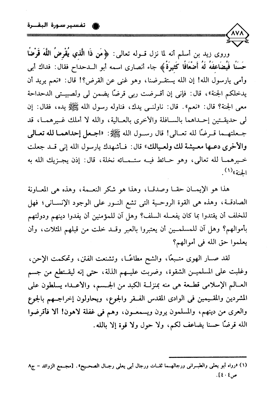 هذا هو الإيمان حقا وصدقا، وهذا هو شكر النعمة، وهذه هي المعاونة الصادقة، وهذه هي القوة الروحية التي تشع النور على الوجود الإنساني؛ فهل للخلف أن يقتدوا بما كان يفعله السلف؛ وهل آن للمؤمنين أن يفدوا دينهم ودولتهم بأموالهم؛ وهل آن للمسلمين أن يعتبروا بالعبر وقد خلت من قبلهم المثلات، وأن يعلموا حق الله في أموالهم؟