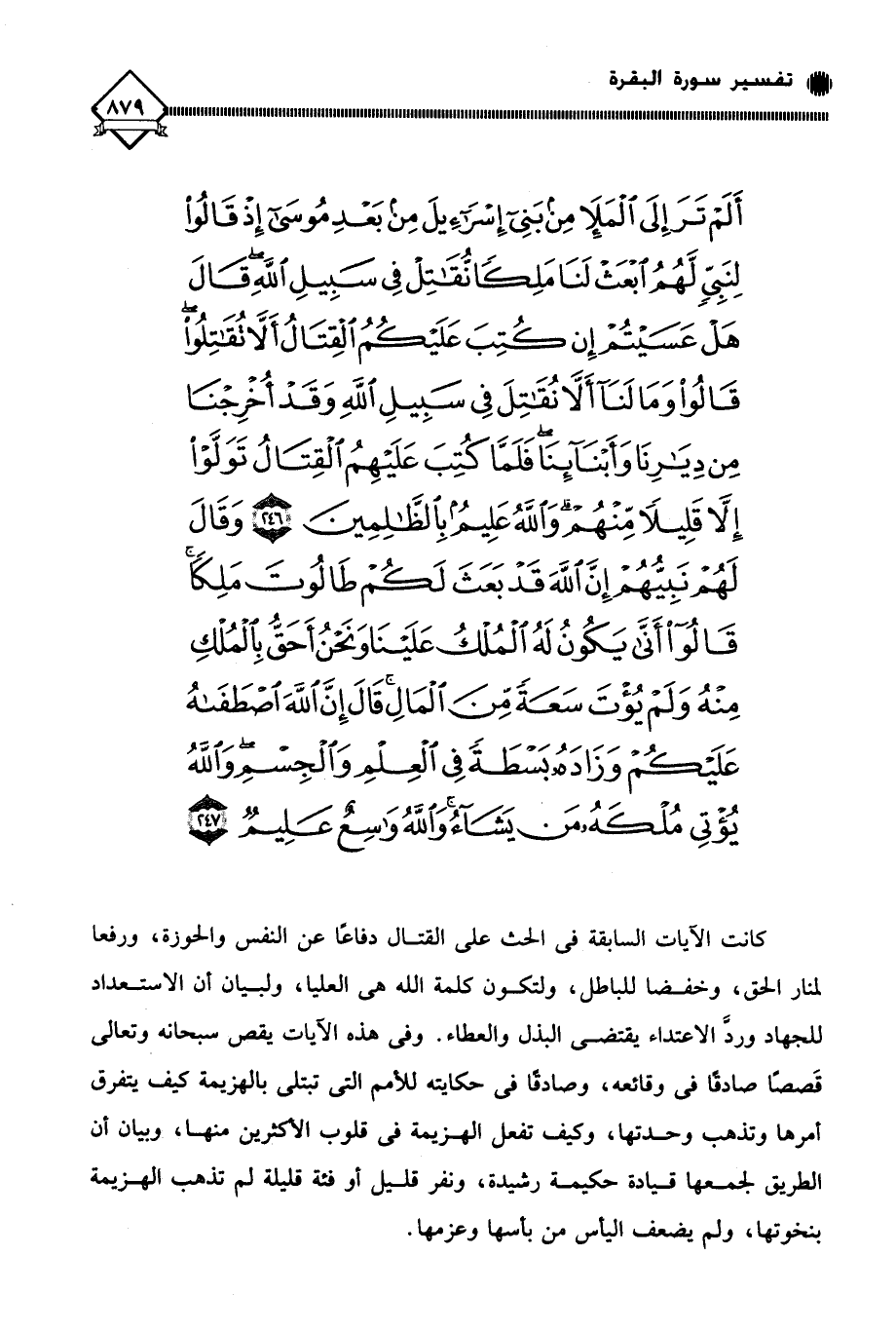 أَلَمْ تَرَ إِلَى الْمَلَإِ مِنْ بَنِي إِسْرَائِيلَ مِنْ بَعْدِ مُوسَى إِذْ قَالُوا لِنَبِيٍّ لَهُمُ ابْعَثْ لَنَا مَلِكًا نُقَاتِلْ فِي سَبِيلِ اللَّهِ قَالَ هَلْ عَسَيْتُمْ إِنْ كُتِبَ عَلَيْكُمُ الْقِتَالُ أَلَّا تُقَاتِلُوا قَالُوا وَمَا لَنَا أَلَّا نُقَاتِلَ فِي سَبِيلِ اللَّهِ وَقَدْ أُخْرِجْنَا مِنْ دِيَارِنَا وَأَبْنَائِنَا فَلَمَّا كُتِبَ عَلَيْهِمُ الْقِتَالُ تَوَلَّوْا إِلَّا قَلِيلًا مِنْهُمْ وَاللَّهُ عَلِيمٌ بِالظَّالِمِينَ (246) وَقَالَ لَهُمْ نَبِيُّهُمْ إِنَّ اللَّهَ قَدْ بَعَثَ لَكُمْ طَالُوتَ مَلِكًا قَالُوا أَنَّى يَكُونُ لَهُ الْمُلْكُ عَلَيْنَا وَنَحْنُ أَحَقُّ بِالْمُلْكِ مِنْهُ وَلَمْ يُؤْتَ سَعَةً مِنَ الْمَالِ قَالَ إِنَّ اللَّهَ اصْطَفَاهُ عَلَيْكُمْ وَزَادَهُ بَسْطَةً فِي الْعِلْمِ وَالْجِسْمِ وَاللَّهُ يُؤْتِي مُلْكَهُ مَنْ يَشَاءُ وَاللَّهُ وَاسِعٌ عَلِيمٌ (247)