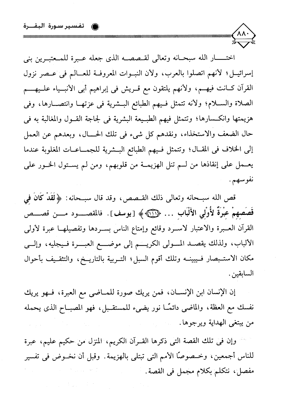 قص الله سبحانه وتعالى ذلك القصص، وقد قال سبحانه: (لَقَدْ كَانَ فِي قَصَصِهِمْ عِبْرَةٌ لأُوْلِي الأَلْبَابِ. . .). فالمقصود من قصص القرآن العبرة والاعتبار لَا سرد وقائع وإمتاع الناس بسردها وتفصيلها عبرة لأولي الألباب، ولذلك يقصد المولى الكريم إلى موضع العبرة فيجليه، وإلى مكان الاستبصار فيبينه وتلك أقوم السبل، التربية بالتاريخ، والتثقيف بأحوال السابقين.