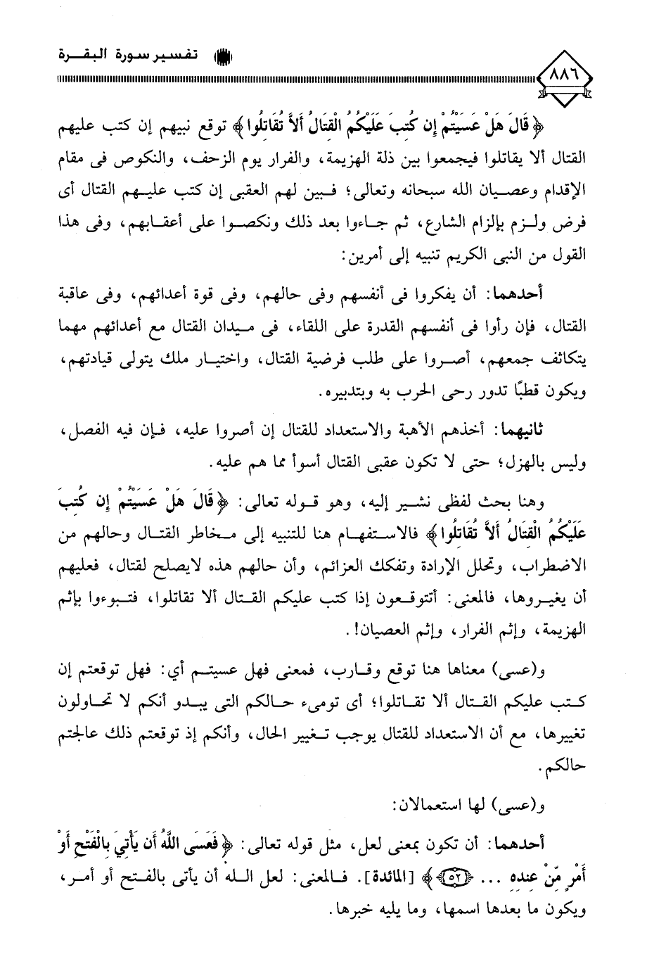 و (عسى) معناها هنا توقع وقارب، فمعنى فهل عسيتم أي: فهل توقعتم إن كتب عليكم القتال ألا نقاتلوا؛ أي تومئ حالكم التي يبدو أنكم لَا تحاولون تغييرها، مع أن الاسنعداد للقنال يوجب تغبير الحال، وأنكم إذ توقعتم ذلك عالجتم حالكم.