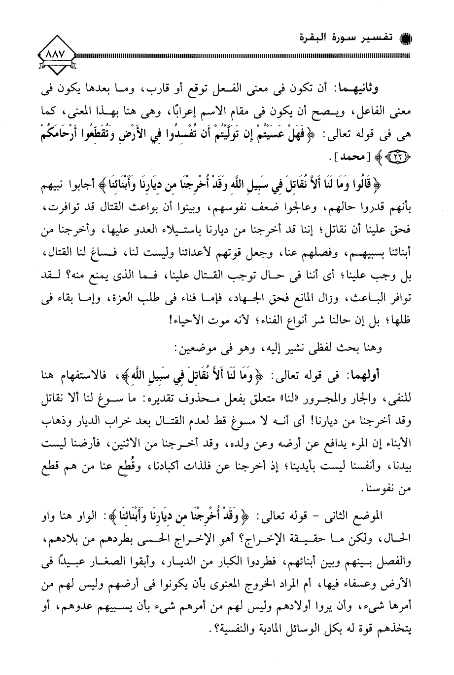 أولهما: في قوله تعالى: (وَمَا لَنَا أَلَّا نُقَاتِلَ فِي سَبِيلِ اللَّهِ)، فالاستفهام هنا للنفي، والجار والمجرور " لنا " متعلق بفعل محذوف تقديره: ما سوغ لنا ألا نقاتل وقد أخرجنا من ديارنا! أي أنه لَا مسوغ قط لعدم القتال بعد خراب الديار وذهاب الأبناء إن المرء يدافع عن أرضه وعن ولده، وقد أخرجنا من الاثنين، فأرضنا ليست بيدنا، وأنفسنا ليست بأيدينا؛ إذ أخرجنا عن فلذات أكبادنا، وقُطِع عنا من هم قطع من نفوسنا.