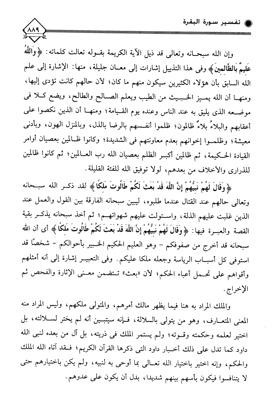 لقد ذكر الله سبحانه وتعالى حالهم عند القتال عندما طلبوه، ليبين سبحانه الفارقة بين القول والعمل عند الذين غلبت عليهم الذلة، واستولت عليهم شهواتهم، ثم أخذ سبحانه يذكر بقية القصة والعبرة فيها: (وَقَالَ لَهُمْ نَبِيّهُمْ إِنَّ اللَّهَ قَدْ بَعَثَ لَكُمْ طَالُوتَ مَلِكًا) أي أن الله سبحانه قد أخرج من صفوفكم - وهو العليم الحكيم الخبير بأحوالكم - شخصًا قد استوفى كل أسباب الرياسة وجعله ملكا عليكم. وفي التعبير إشارة إلى أنه أمثلهم وأقواهم على تحمل أعباء الحكم؛ لأن " بعث " تتضمن معنى الإثارة والفحص ثم الإخراج.