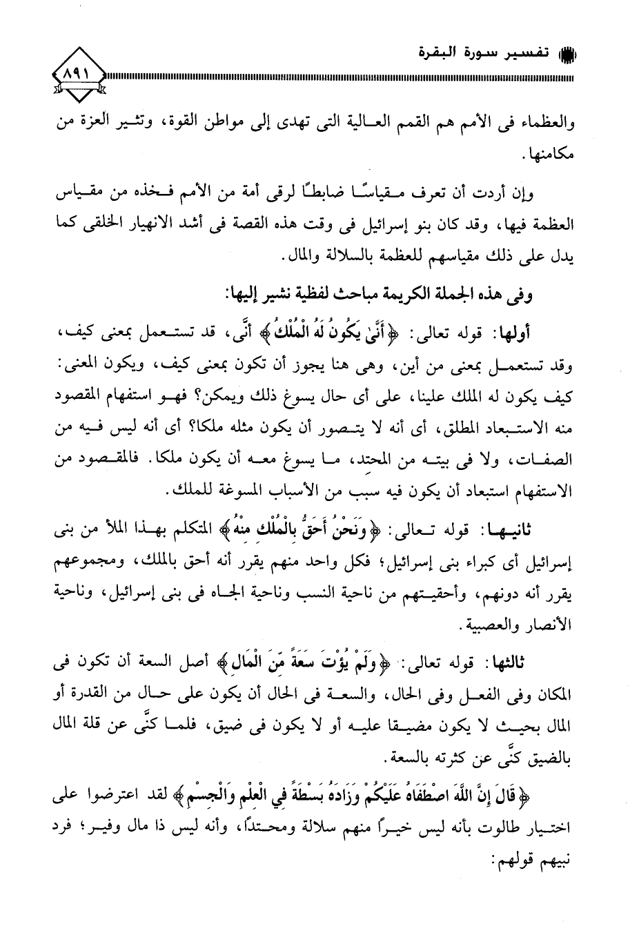 وإن أردت أن تعرف مقياسًا ضابطا لرقي أمة من الأمم فخذه من مقياس العظمة فيها، وقد كان بنو إسرائيل في وقت هذه القصة في أشد الانهيار الخلقي كما يدل على ذلك مقياسهم للعظمة بالسلالة والمال.