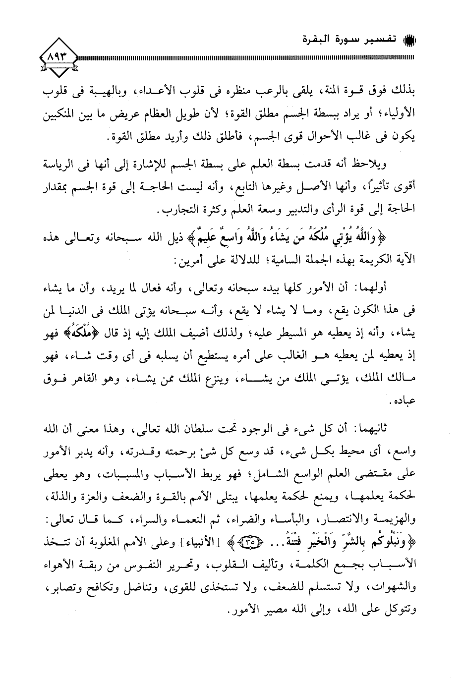 ويلاحظ أنه قدمت بسطة العلم على بسطة الجسم للإشارة إلى أنها في الرياسة أقوى تأثيرًا، وأنها الأصل وغيرها التابع، وأنه ليست الحاجة إلى قوة الجسم بمقدار الحاجة إلى قوة الرأي والتدبير وسعة العلم وكثرة التجارب.