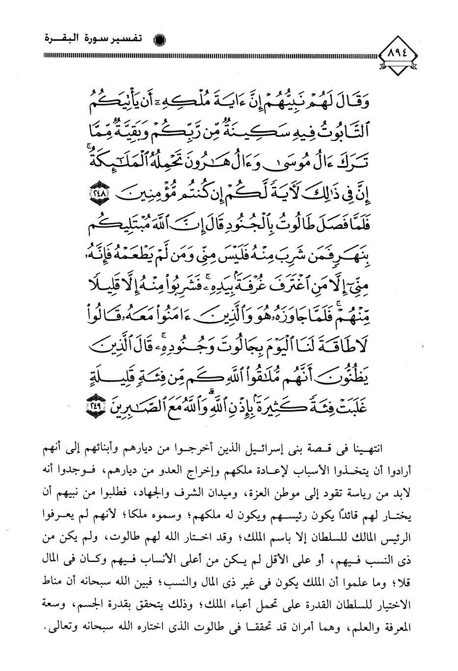 (وَقَالَ لَهُمْ نَبِيُّهُمْ إِنَّ آيَةَ مُلْكِهِ أَنْ يَأْتِيَكُمُ التَّابُوتُ فِيهِ سَكِينَةٌ مِنْ رَبِّكُمْ وَبَقِيَّةٌ مِمَّا تَرَكَ آلُ مُوسَى وَآلُ هَارُونَ تَحْمِلُهُ الْمَلَائِكَةُ إِنَّ فِي ذَلِكَ لَآيَةً لَكُمْ إِنْ كُنْتُمْ مُؤْمِنِينَ (248) فَلَمَّا فَصَلَ طَالُوتُ بِالْجُنُودِ قَالَ إِنَّ اللَّهَ مُبْتَلِيكُمْ بِنَهَرٍ فَمَنْ شَرِبَ مِنْهُ فَلَيْسَ مِنِّي وَمَنْ لَمْ يَطْعَمْهُ فَإِنَّهُ مِنِّي إِلَّا مَنِ اغْتَرَفَ غُرْفَةً بِيَدِهِ فَشَرِبُوا مِنْهُ إِلَّا قَلِيلًا مِنْهُمْ فَلَمَّا جَاوَزَهُ هُوَ وَالَّذِينَ آمَنُوا مَعَهُ قَالُوا لَا طَاقَةَ لَنَا الْيَوْمَ بِجَالُوتَ وَجُنُودِهِ قَالَ الَّذِينَ يَظُنُّونَ أَنَّهُمْ مُلَاقُو اللَّهِ كَمْ مِنْ فِئَةٍ قَلِيلَةٍ غَلَبَتْ فِئَةً كَثِيرَةً بِإِذْنِ اللَّهِ وَاللَّهُ مَعَ الصَّابِرِينَ (249)