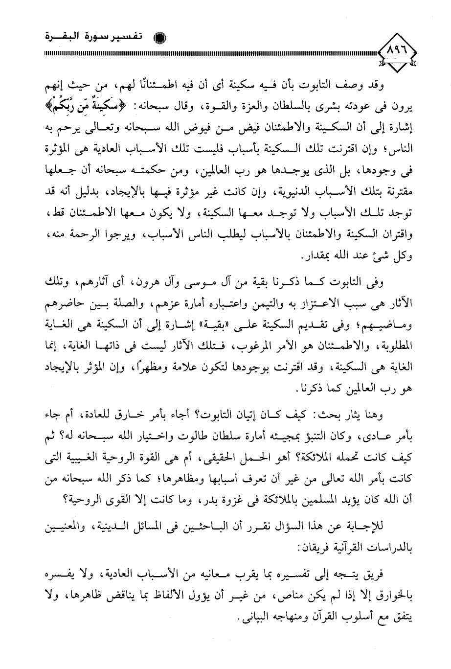 وهنا يثار بحث: كيف كان إتيان التابوت؟ أجاء بأمر خارق للعادة، أم جاء بأمر عادي، وكان التنبؤ بمجيئه أمارة سلطان طالوت واختيار الله سبحانه له؛ ثم كيف كانت تحمله الملائكة؟ أهو الحمل الحقيقي، أم هي القوة الروحية الغيبية التي كانت بأمر الله تعالى من غير أن تعرف أسبابها ومظاهرها؛ كما ذكر الله سبحانه من أن الله كان يؤيد المسلمين بالملائكة في غزوة بدر، وما كانت إلا القوى الروحية؛ للإجابة عن هذا السؤال نقرر أن الباحثين في المسائل الدينية، والمعنيين بالدراسات القرآنية فريقان: