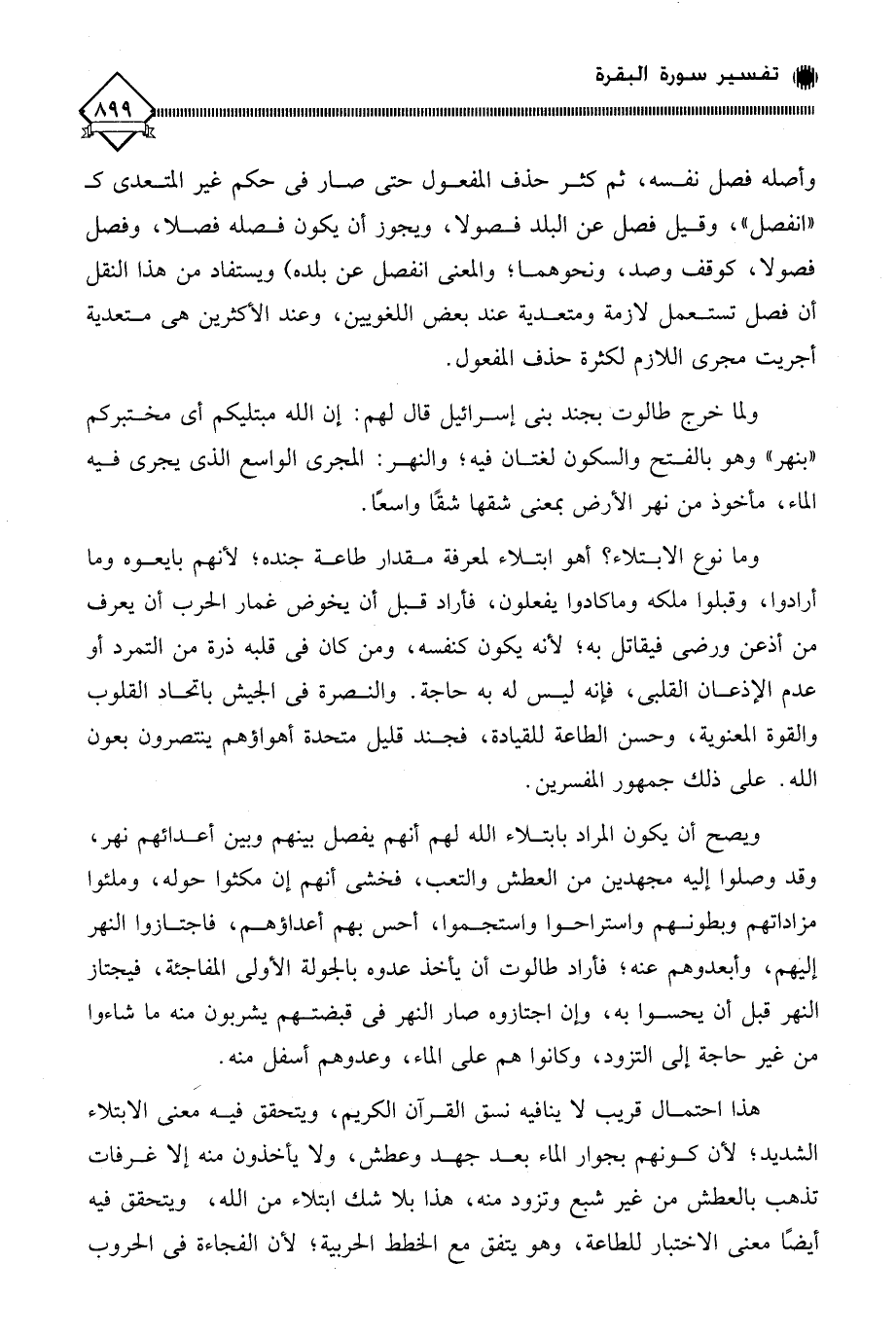 هذا احتمال قريب لَا ينافيه نسق القرآن الكريم، ويتحقق فيه مَعنى الابتلاء الشديد؛ لأن كونهم بجوار الماء بعد جهد وعطش، ولا يأخذون منه إلا غرفات تذهب بالعطش من غير شبع وتزود منه، هذا بلا شك ابتلاء من الله، ويتحقق فيه أيضًا معنى الاختبار للطاعة، وهو يتفق مع الخطط الحربية؛ لأن الفجاءة في الحروب