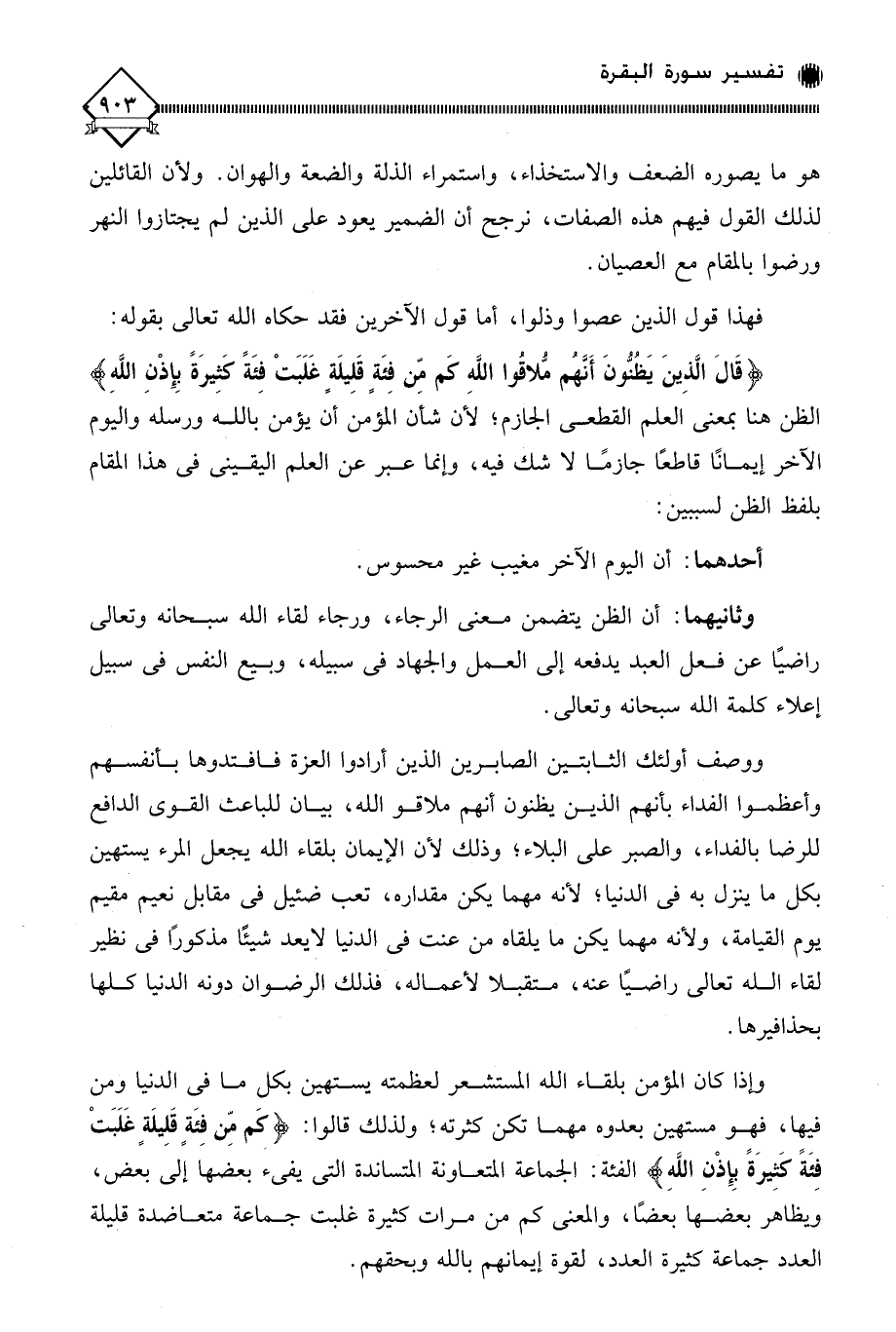 فهذا قول الذين عصوا وذلوا، أما قول الآخرين فقد حكاه الله تعالى بقوله: (قَالَ الَّذِينَ يَظُنُّونَ أَنَّهُمْ مُلَاقُو اللَّهِ كَمْ مِنْ فِئَةٍ قَلِيلَةٍ غَلَبَتْ فِئَةً كَثِيرَةً بِإِذْنِ اللَّهِ) الظن هنا بمعنى العلم القطعي الجازم؛ لأن شأن المؤمن أن يؤمن بالله ورسله واليوم الآخر إيمانًا قاطعًا جازمًا لَا شك فيه، وإنما عبر عن العلم اليقيني في هذا المقام بلفظ الظن لسببين: