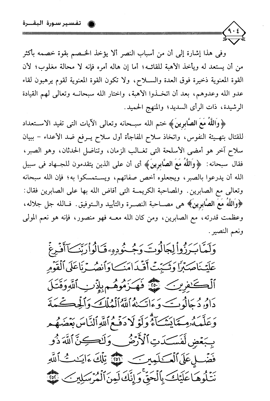 (وَلَمَّا بَرَزُوا لِجَالُوتَ وَجُنُودِهِ قَالُوا رَبَّنَا أَفْرِغْ عَلَيْنَا صَبْرًا وَثَبِّتْ أَقْدَامَنَا وَانْصُرْنَا عَلَى الْقَوْمِ الْكَافِرِينَ (250) فَهَزَمُوهُمْ بِإِذْنِ اللَّهِ وَقَتَلَ دَاوُودُ جَالُوتَ وَآتَاهُ اللَّهُ الْمُلْكَ وَالْحِكْمَةَ وَعَلَّمَهُ مِمَّا يَشَاءُ وَلَوْلَا دَفْعُ اللَّهِ النَّاسَ بَعْضَهُمْ بِبَعْضٍ لَفَسَدَتِ الْأَرْضُ وَلَكِنَّ اللَّهَ ذُو فَضْلٍ عَلَى الْعَالَمِينَ (251) تِلْكَ آيَاتُ اللَّهِ نَتْلُوهَا عَلَيْكَ بِالْحَقِّ وَإِنَّكَ لَمِنَ الْمُرْسَلِينَ (252)