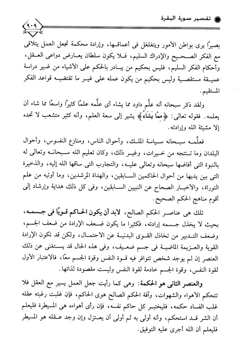 بصيرًا يرى بواطن الأمور ويتغلغل في أعماقها، وإرادة محكمة تجعل العمل يتلاقى مع الفكر الصحيح والإدراك السليم، فلا يكون سلطان يعارض دواعي العقل، وأحكام الفكر السليم، فليس بحكيم من يبادر بالحكم على الأشياء من غير دراسة عميقة مستقصية وليس بحكيم من يكون عمله على غير ما تقتضيه قواعد الفكر المسمَقيم.